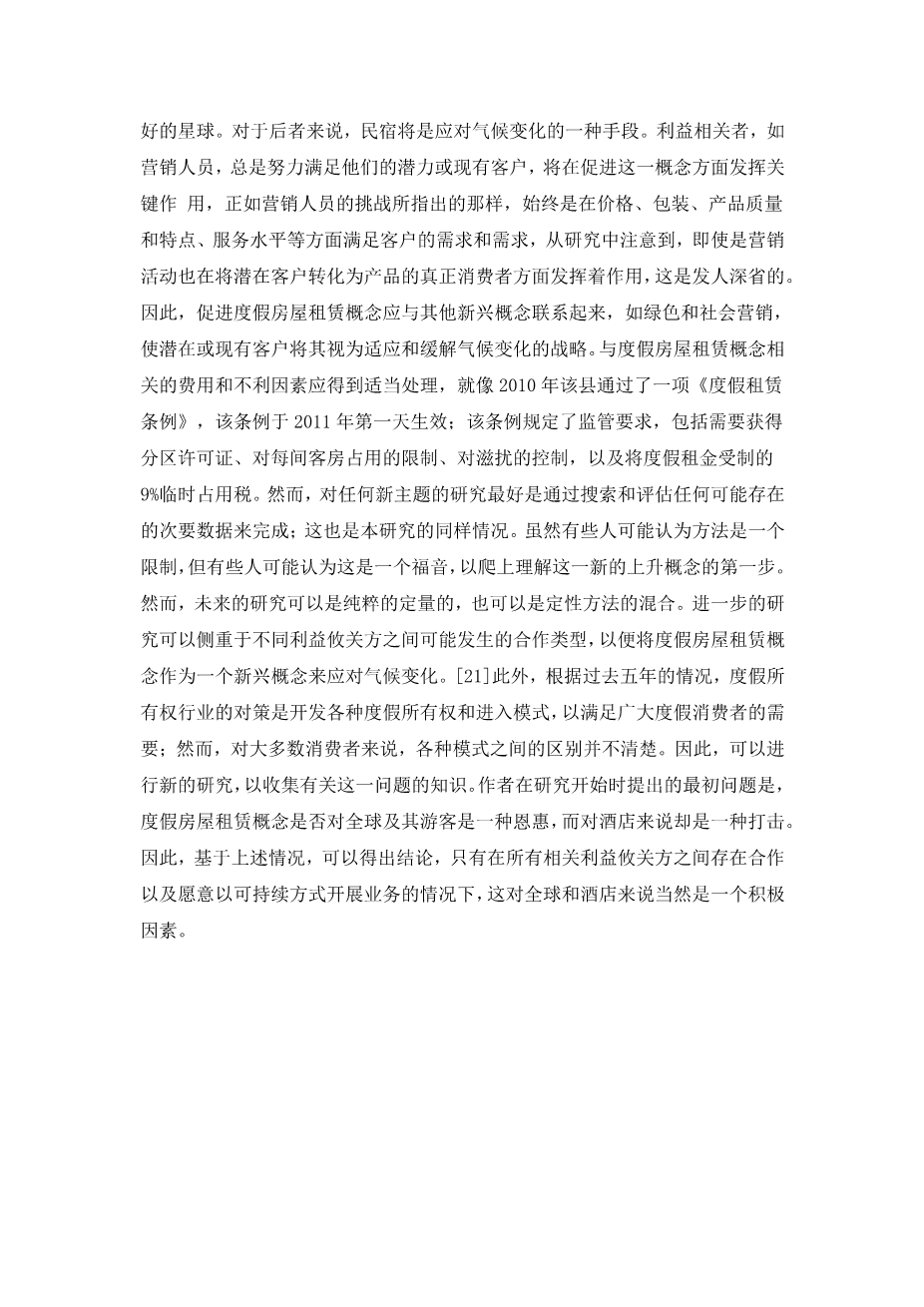 modation concept, it will certainly have its plus or minus points. Concerned authorities and stakeholders should judiciously understand the above, plan and work out polices that would make the positive points of vacation home rentals outweigh the negative ones. One way of viewing this concept would be from the perspective of stakeholders working towards a better, safer and ecofriendly planet. For the latter, vacation home rental concepts would be a means of coping with climate changes. Stakeholders such as marketers who are always striving to satisfy their potential or existing customers would have a key role in promoting this concept and as stated by [19] the challenge of marketers has always been to satisfy the needs and wants of clients in terms of price, packaging, product quality and features, service level amongst others and it was thought-provoking to note from the study that even marketing activities had a role in converting potential customers to genuine consumers of a product. Hence, promotional of the vacation home rental concept should be connected to other emerging concepts such as green and social marketing so as to make potential or existing customers view it as strategies for adaptation and mitigation to climate changes. Costs and disadvantages linked to the vacation home rental concepts should be duly addressed like as per [9]: The County adopted a Vacation Rental Ordinance in 2010 that became effective on the first day of 2011; the Ordinance established regulatory requirements including the need to obtain a zoning permit, limits on per room occupancy, controls on nuisance, and subjecting the vacation rentals to the County’s 9 percent Transient Occupancy Tax. Teamwork and collaboration between stakeholders is important instead of viewing a new concept as a threat to existing accommodation facilities such as hotels, it should be considered as an aid provided to the planet by alleviating its sufferings due to climatic changes and by preventing more to occur. As per [20] with rising environmental issues such as global warming, the transport industry had to evolve so as to provide greener means of transportation and satisfy demands for eco-friendly technologies. So, why not
