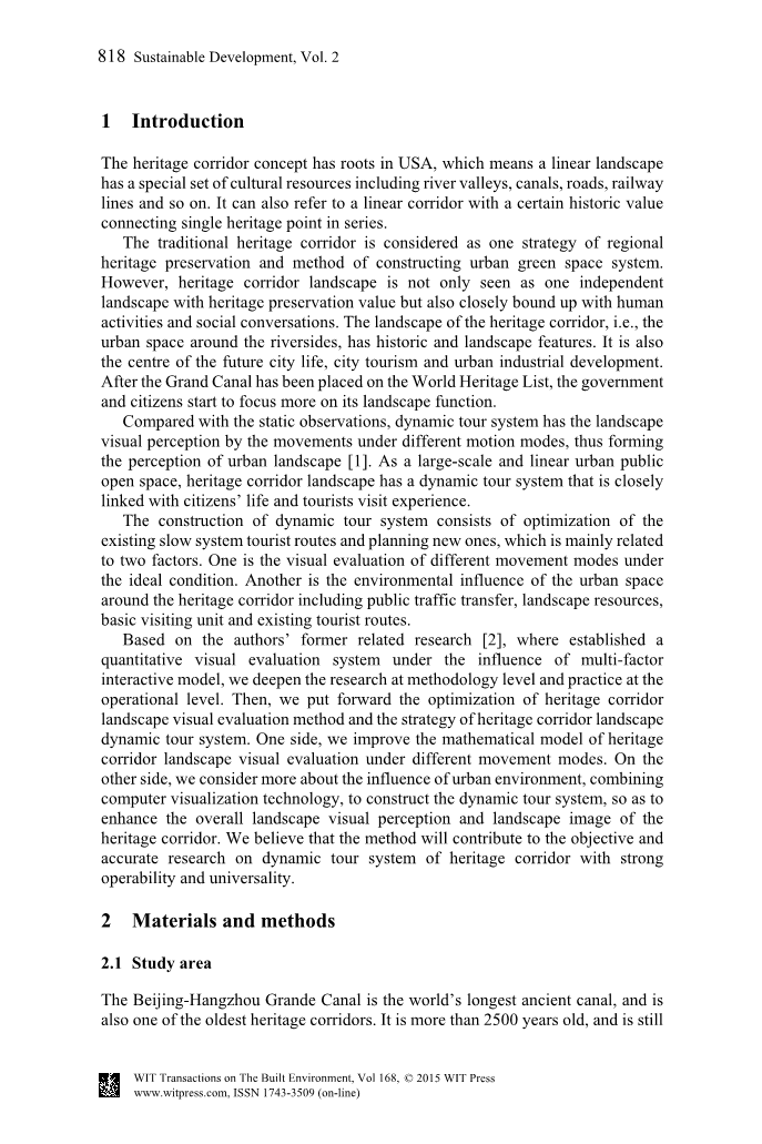 传统的遗产廊道被认为是区域遗产保护的一种策略,它与城市绿地系统有着密切的联系。然而,作为一个大规模、线性的城市公共开放空间,遗产廊道景观具有与市民生活和游客参观体验息息相关的动态旅游体系。在前面的相关研究中,我们介绍了景观视觉注意度的概念。然后通过对遗产廊道景观的视觉评价标准和动态旅游景观特征的研究,建立了多因素交互模型影响下的定量视觉评价系统。在此基础上,以京杭运河(杭州段)为例,深化了方法层面的研究和实践层面的实践。一方面,通过建立景观视觉关注度的成对比较量化方案,优化了不同移动模式下的遗产廊道景观视觉评价方法,并在多个影响下改进了一个定量的视觉评价模型。因素。另一方面,通过对遗产廊道周边城市环境的分析,结合计算机可视化技术,构建动态旅游系统,以提高遗产廊道的整体景观视觉感知和景观形象。