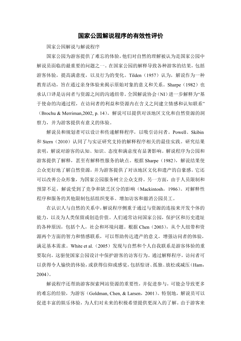 National parks provide memorable experiences for visitors, and their understanding of nature is considered to be one of the most important issues facing interpreters at national parks. Interpretation in national parks result in a variety of visitor outcomes, including visitor experience, improved satisfaction, and behavior change. According to Tilden (1957), interpretation is defined as an educational activity which aims to reveal meaning and relationships through the original objects by firsthand experience. Sharpe (1982) also acknowledged that interpretation is the communication link between the visitor and the resources. The National Association for Interpretation (NAI) further defined interpretation as “a mission-based communication process that forges emotional and cognitive connections between the interests of the visitor and the meanings inherent in the resource” (Brochu amp; Merriman,2002, p. 14). Interpretation can offer insight into the cultural and natural resources of the area, and provide the visitor with meaningful experiences.