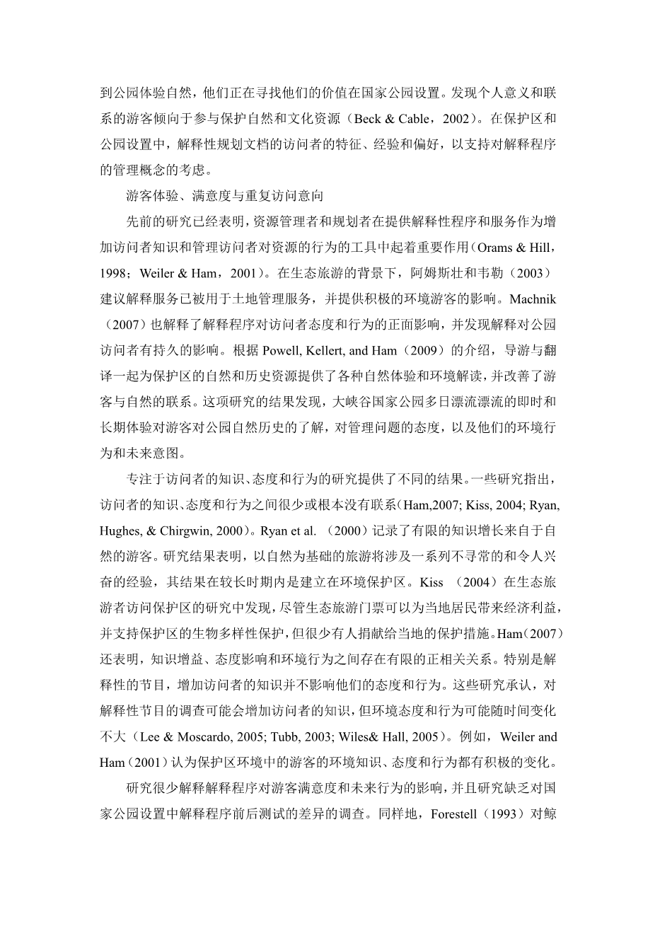 Previous research has suggested that resource managers and planners play an important role in providing interpretive programs and services as a tool for increasing visitor knowledge and managing visitor behaviors towards resources (Orams amp; Hill, 1998; Weiler amp; Ham,2001). Within the context of ecotourism, Armstrong and Weiler (2003) suggested that interpretive services have been used for land management services and providing positive environmental visitor impacts. Machnik (2007) also identified which interpretive programs positively affected visitors’attitudes and actions, and found that the interpretation had lasting effects on park visitors. According to Powell, Kellert, and Ham (2009), tours with an interpreter offer various natural experiences and environmental interpretation of the protected area's natural and historical resources, and improve visitors’connection with nature. Results from this study found the immediate and long-term influence of the Grand Canyon National Park multi-day whitewater rafting experiences on visitors’knowledge of the park's natural history, attitudes toward the management issues, and their environmental behaviors and future intentions.