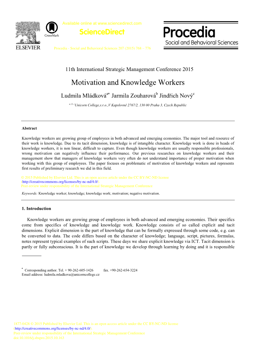 知识型员工的激励是一个非常具体的话题。文献表明知识型员工是那些通常有高度的表现良好激励的人(德鲁克, 1954, 达文波特, 2005, Reboul 等, 2006)是那些能够决定和管理自己的活动 (Suff 和莱利, 2005, Gummesson, 2002)。但是, 不同的激励理论表明不同的人受不同的激励,这同样适用于知识型员工。考虑到知识工作的特殊性,知识型员工的激励是一个重要的课题。我们以往对知识型员工及其管理的研究表明,知识型员工的管理者往往不理解在与这群员工共事时适当激励的重要性(Mlaacute;dkovaacute;, 2012a, b, Mlaacute;dkovaacute;, 2013)。