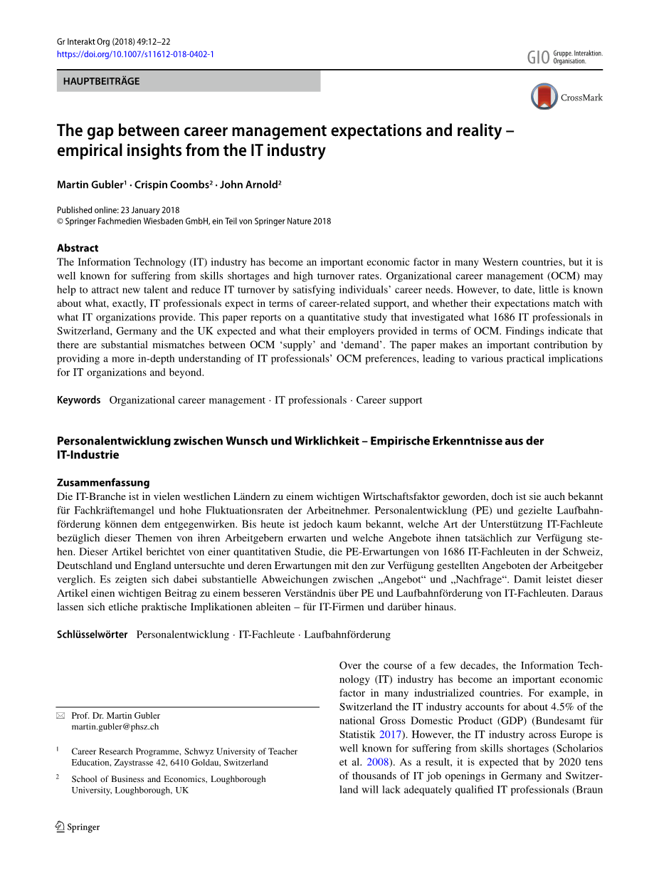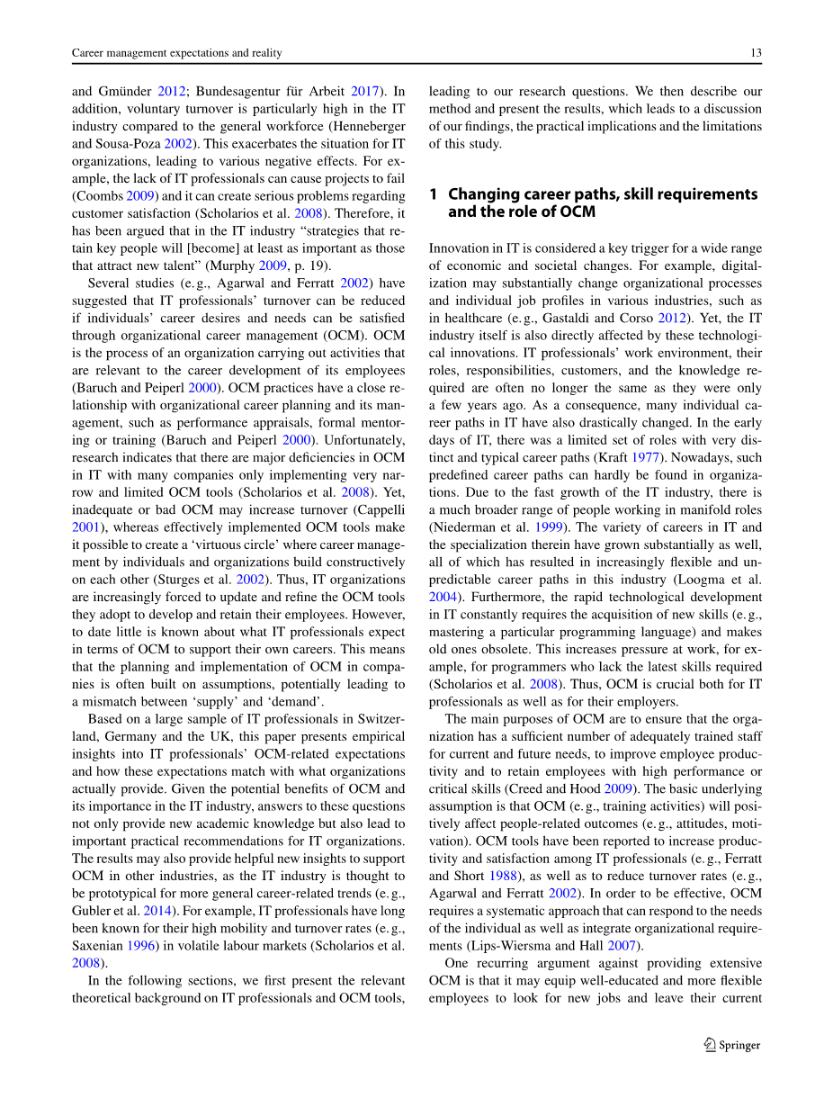 本文基于瑞士,德国和英国的大量IT专业人员样本,对IT专业人士的OCM相关期望以及这些期望如何与组织实际提供的期望相匹配提供了实证分析。考虑到OCM的潜在益处及其在IT行业的重要性,对这些问题的回答不仅提供了新的学术知识,而且为IT组织提供了重要的实用建议。该结果也可能为其他行业的OCM提供有用的新见解,因为IT行业被认为是典型的一般职业相关趋势(比如,Gubleretal.2014)。例如,IT专业人员在动荡的劳动力市场中(Scholarios et al. 2008)一直以其高流动性和流失率(如, Saxenian 1996))而闻名。