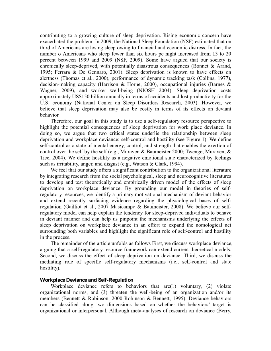 本文的其余部分展开如下:首先,我们讨 论了工作场所的偏差行为,提出了一个可以扩展现有的理论框架的自我调节资源模型。其次,我们讨论了睡眠剥夺对偏差行为的影响。第三,我们讨论了具体的自我调节机制的中介作用,即自我控制和敌意状态。