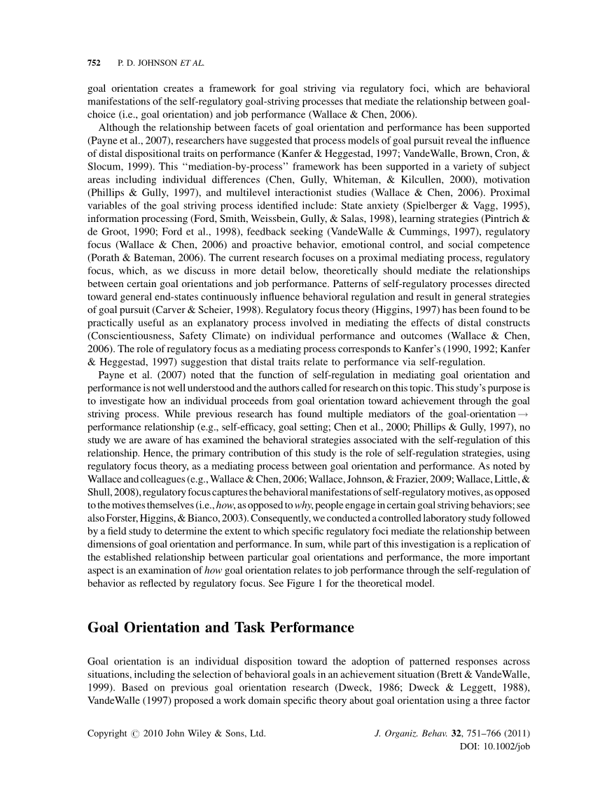 虽然目标导向和绩效之间的关系得到支持(Payne et al。,2007),但研究人员认为,目标追求的过程模型揭示了远端性格特征对绩效的影响(Kanfer&Heggestad,1997; Vande Walle, Brown,Cron,&Slocum,1999)。这种“逐层调节”的框架已经在包括个体差异(Chen,Gully,Whiteman,&Kilcullen,2000),动机(Phillips&Gully,1997)和多层次互动研究Wallace&Chen,2006)。目标奋斗过程的近似变量包括:状态焦虑(Spielberger&Vagg,1995),信息处理(福特,史密斯,韦斯拜恩,Gully和萨拉斯,1998),学习策略(Pintrich&de Groot,1990; Ford et al。 (VandeWalle&Cummings,1997),调节焦点(Wallace&Chen,2006)以及主动行为,情绪控制和社交能力(Porath&Bateman,2006)。目前的研究主要集中在一个近端调节过程,调节焦点,正如我们在下面详细讨论的,理论上应该调节某些目标导向和工作绩效之间的关系。针对一般最终状态的自我调节过程模式不断影响行为规范,并产生目标追求的一般策略(Carver&Scheier,1998)。调节焦点理论(Higgins,1997)被认为是一种解释过程,涉及远端结构(严谨性,安全气氛)对个体表现和结果的调节(Wallace&Chen,2006)。调节焦点作为调节过程的作用与Kanfer(1990,1992; Kanfer&Heggestad,1997)的建议相一致,即远端特征与自我调节的表现有关。