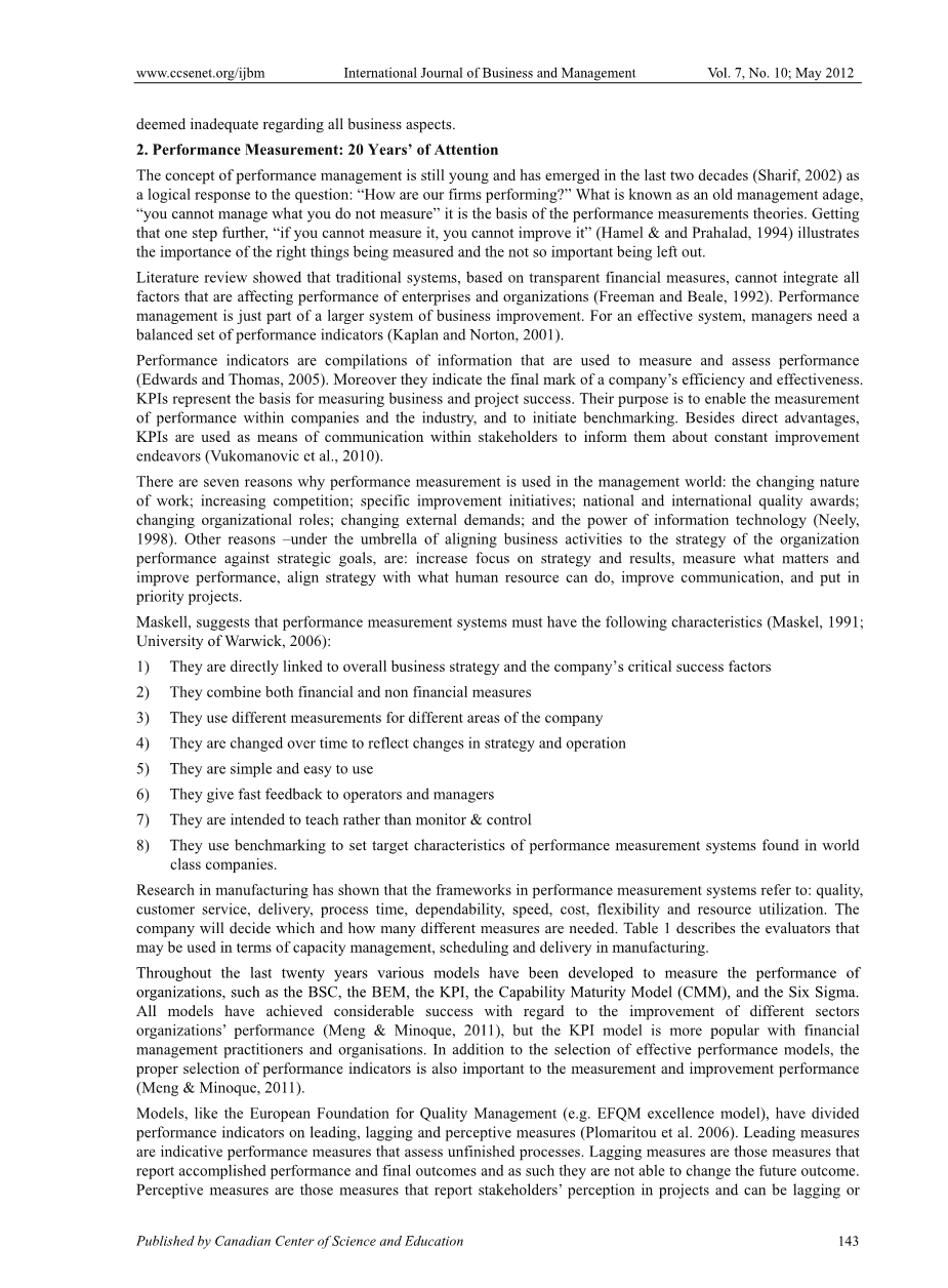 在过去的二十年中,已经开发了各种模型来衡量组织的绩效,如BSC、BEM、KPI、能力成熟度模型(CMM)和六西格玛。所有的模型在改进不同行业组织的表现方面都取得了相当大的成功(Meng amp; Minoque, 2011),但是KPI模型在财务管理从业者和组织中更受欢迎。除了有效的绩效模型的选择之外,适当的绩效指标的选择对于测量和提高绩效也很重要(Meng amp; Minoque, 2011)。