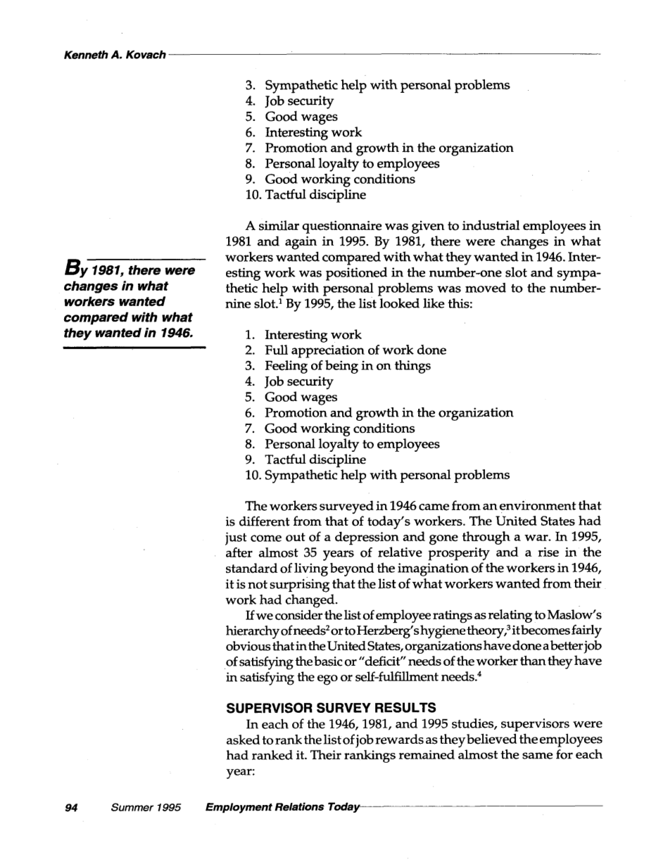The workers surveyed in 1946 came from an environment that is different from that of todayrsquo;s workers. The United States had just come out of a depression and gone though a war. In 1995, after almost 35 years of relative prosperity and a rise in the standard of living beyond the imagination of the workers in 1946, it is not surprising that the list of what workers wanted from their work had changed. If we consider the list of employee ratings as relating to Maslowrsquo;s hierarchy of needs or to Herzbergrsquo;s hygiene theory: it becomes fairly obvious that in the united States, organizations have done a better job of satisfying the basic or ”deficit” needs of the worker than they have in satisfying the ego or self-fulfillment needs.