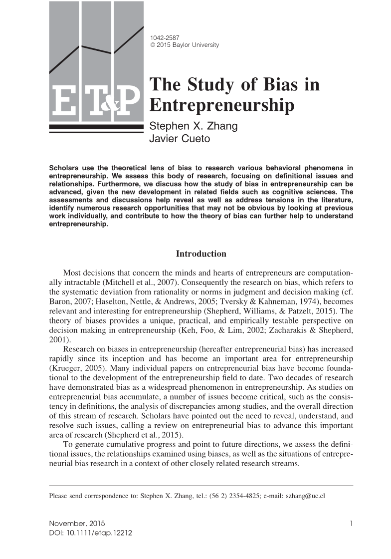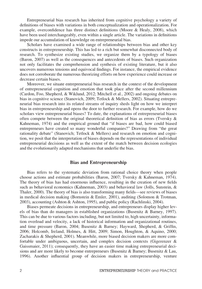 大多数有关企业家的思想和决策的决策是难以计算的(Mitchell et al., 2007)。因此,关于偏差的研究,即系统地偏离判断或决策中的合理性或规范(cf.Baron, 2007; Haselton, Nettle, amp; Andrews, 2005; Tversky amp; Kahneman, 1974),就成为企业家的相关和有趣的问题(Shepherd, Williams, amp; Patzelt, 2015)。偏差理论为创业决策提供了一个独特、实用、可实证的视角(Keh, Foo, amp; Lim, 2002; Zacharakis amp; Shepherd,2001)。