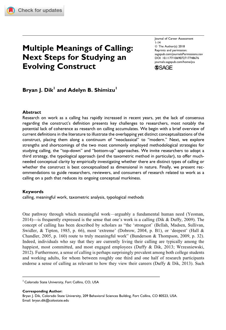 在关于使命感的研究中,有许多采用这种方法的例子(例如,Bundersonamp;Thompson,2009年;Hagmayeramp;Abele,2012;Dik,Duffy,El