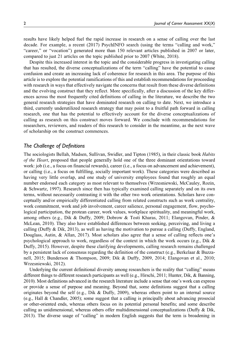 社会学家Bellah, Madsen, Sullivan, Swidler和Tipton(1985)在他们的经典著作《心脏的习惯》中说到,人们普遍拥有三个主要的工作方向之一:工作(聚焦于物质收获)、职业(聚焦于提升与成就)、和使命感(专注于满足社会的重要工作)。这三个类别几乎没有重叠,并且一个关于大学职员的研究发现这三个类别的支持者的数量大致相同(Wrzesniewski, McCauley, Rozin, amp; Schwartz, 1997)。从那以后使命感的研究都是基于自身方向来研究而不是与其他两个方向进行对比。学者们从概念上和/或经验上将使命感从相关的结构中,如工作重心、工作承诺、工作投入、职业显著性、个人参与、流动、心理参与、职业改变、工作价值、工作精神氛围和有意义的工作等相关概念。(e.g., Dik amp; Duffy, 2009; Dobrow amp; Tosti Kharas, 2011; Elangovan, Pinder, amp; McLean, 2010)。他们也已经确立寻找、感知、得到以及有激情的追求使命感的区别(Duffy amp; Dik, 2013) (Duffy, England, Douglass, Autin, amp; Allan, 2017)。大多数学者仍同意,不论工作到底处于怎样的背景下,使命感都反映了一个人工作的心路历程 (e.g., Dik amp; Duffy, 2015)。然而,即使有这些明确的进展,使命感的研究仍然被持续缺乏一致性的结构定义所挑战(e.g., Berkelaar amp; Buzzanell, 2015; Bunderson amp; Thompson, 2009; Dik amp; Duffy, 2009, 2014; Elangovan et al., 2010; Wrzesniewski, 2012)。