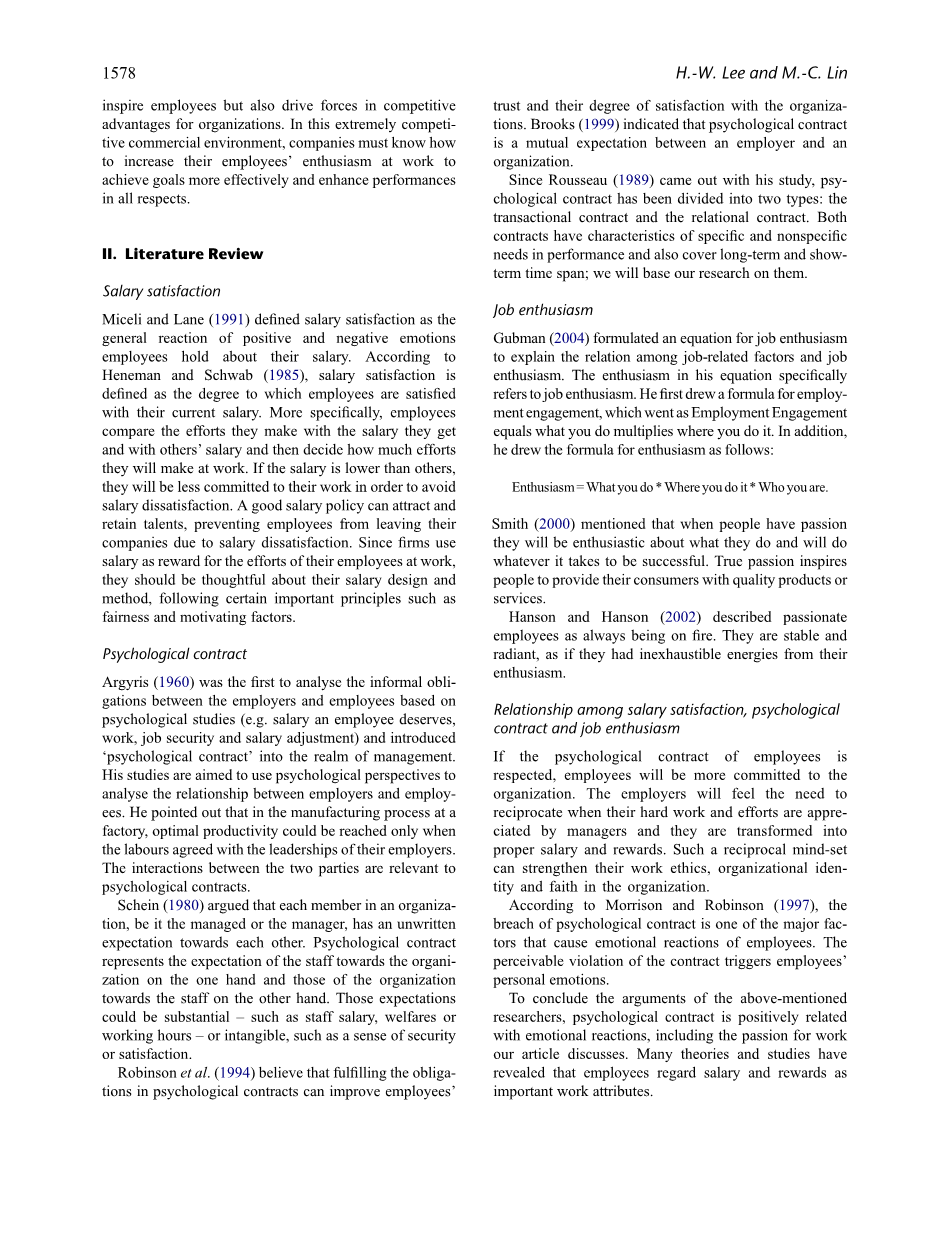 综上所述,心理契约与情绪反应正相关,包括对工作的热情。许多理论和研究表明,员工认为薪酬是重要的工作属性。