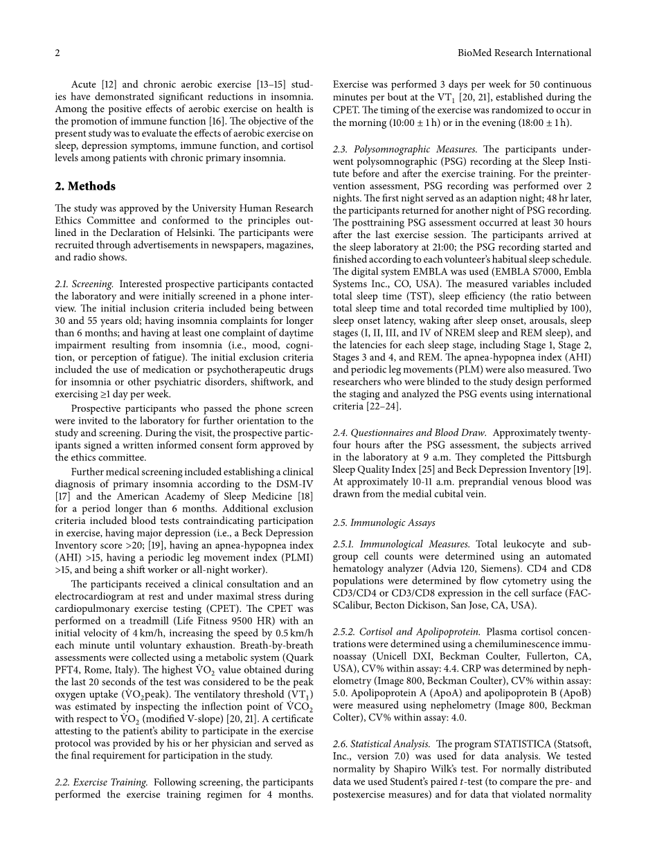 运动改善慢性原发性失眠症患者的免疫功能、抗抑郁反应和睡眠质量外文翻译资料