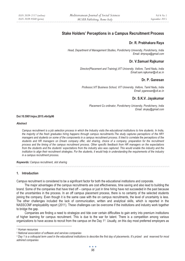 校园招聘是一个工作选择过程,即是企业直接访问教育机构雇用学生的过程。 在印度,大多数新毕业生招聘都是通过校园招聘进行的。本文所做的研究通过收集了许多资深人力资源部门经理和应届毕业学生对校园招聘流程中的一些看法,组成部分的。它试图将学生和人力资源经理对理想公司提供的看法,时隙共享,选择公司,招聘过程准备和校园招聘流程的时间等看法相关联。 与此同时,还收集了来自人力资源经理对学生期望和学生对行业期望的其他具体反馈。 通过上述活动的联系考察,不仅会帮助行业和机构能够调整其招聘战略。 而且,对于应届毕业生来说,这也将有助于他们了解在校园招聘过程中企业的要求。
