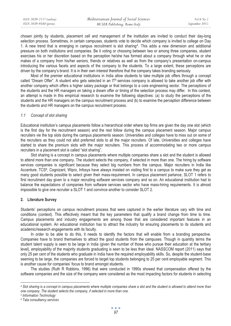 印度的大多数首屈一指的教育高等院校受到一个名为“理想录用通知”的概念影响,允许学生获得多份工作机会意向书。在信息技术服务公司中被选中的学生,可允许与另一个提供更高薪水福利或属于核心工程部门的公司再提交并签署录用通知合同。学生和人力资源经理对于接受理想录用协议或选择过程的时间安排的看法可能不同。在这种情况下,本文试图研究并达成以下目标:(a)研究学生和人力资源经理对校园招聘流程的看法;(b)研究校园招聘过程中学生与人力资源经理之间的差异。