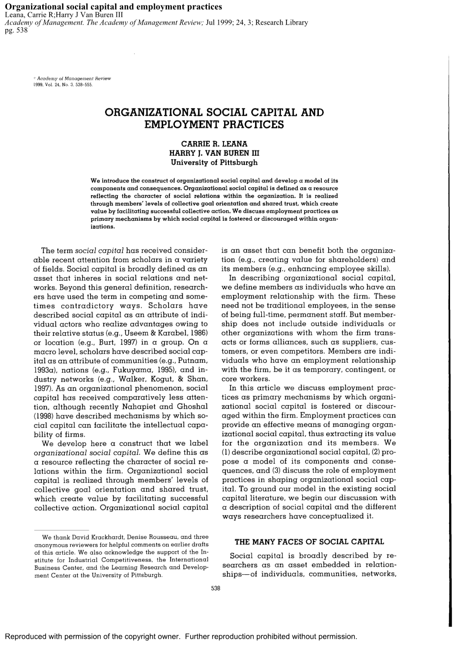 我们介绍组织社会的资本构造并且发展一个它的成份和结果的模型。组织的社会资本被定义为在组织里面反映社会关系的个性的资源。它是通过成员的共同目标方向来实现的,并且分享了信赖, 这藉由促进成功的集体行动产生价值。我们讨论如在社会的资本在组织里面被养育或气馁方面所依据的主要机制的雇用练习。