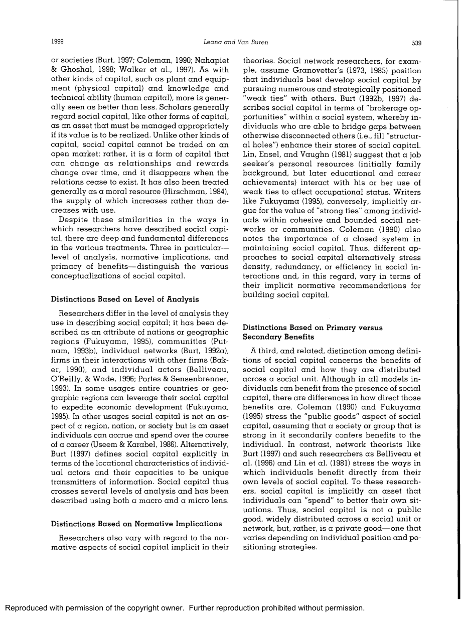 研究员也在他们的理论中因对社会资本的隐含的标准方面的关心而改变。社会的网络研究员,举例来说,承担 Granovetter(1973,1985) 位置个体最好藉由追求发展社会资本很多的而且战略上和其它放置了 ' 弱的关系 '。 Burt(1992b,1997) 在一个社会的系统里面根据 ' 经纪业机会 ' 描述社会的资本, 那里能够在以别的方式分离之间以桥连接缝隙的个体其它 (也就是, 填充 ' 结构的洞 ') 提高他们的社会资本的商店。林, Ensel 和 Vaughn(1981) 建议工作搜索者的个人资源 (最初家庭背景, 但是稍后教育的和事业成就) 与弱关系的他或者她的使用互动影响职业的状态。像 Fukuyama 的作家 (1995), 相反地, 暗示地为在个体之中的 ' 强烈的关系 ' 的价值争论在前后一贯的里面而且跳跃了社会的网络或社区。科尔曼 (1990) 也在维持社会的资本方面注意关闭系统的重要。因此, 不同的方法到社会的资本二者择一地强调社会的交互作用的密度,多余或效率而且强调为建筑社会的资本,在这关心方面,根据他们的暗示标准的推荐改变。