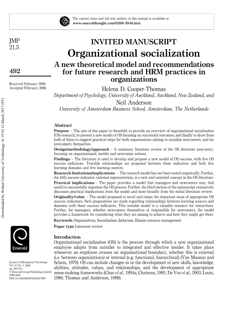 组织社会化(OS)是一个新的组织性员工从外部人员融入到内部和内部的过程。只要员工跨越组织边界,无论是外部的(即组织之间)还是内部(例如功能性,层次化)(Van Maanen和Schein,1979)。操作系统可以包括新技能,知识,能力,态度,价值观和关系的变化或发展,以及适当的感觉制定框架的发展(Chao et al。,1994a; Chatman,1991; De Vos et al。 2003; Louis,1980; Thomas and Anderson,1998)。