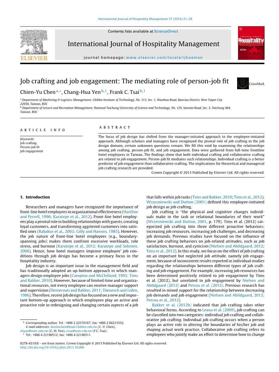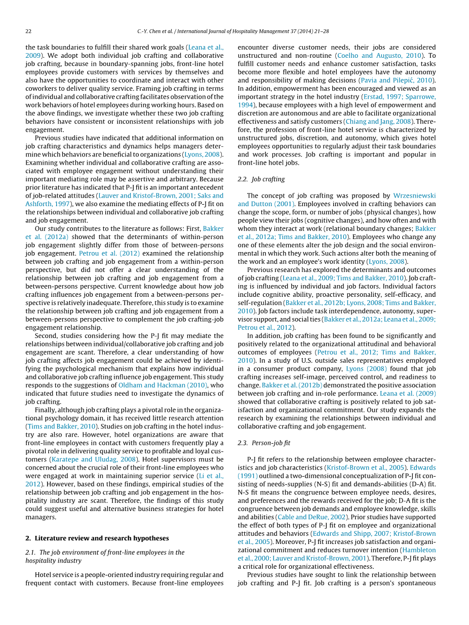 先前的研究非常关注工作设计对员工态度和行为的影响(Leana等人,2009年)。本研究涉及到工作参与领域,并通过考虑员工工作制作,为酒店业的工作设计文献做出了贡献。研究结果表明,个体工艺和协作工艺都能加强工作参与。这些实证研究结果支持了Tims和Bakker(2010)的观点,即工作设计导致员工的工作参与。人岗匹配还调解个人/协作工作制作与工作参与之间的关系。最后,通过人岗拟合,个体工作制作对参与的间接影响大于协同工作制作的间接影响。我们的研究结果以几种方式补充了以前的工作。