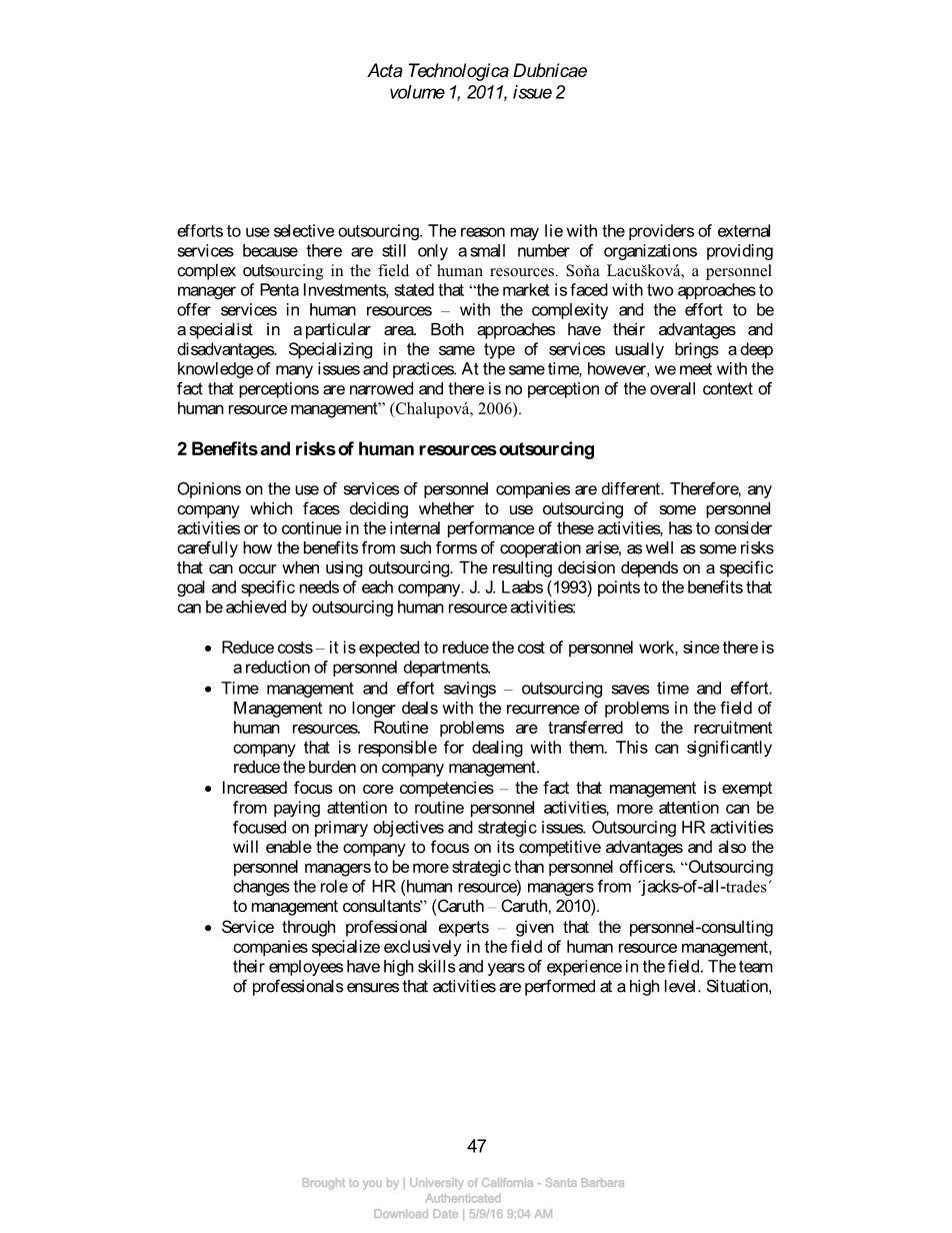 许多作者认为外包是获得高质量员工的一种方式。目前,市场上存在着大量提供人力资源管理服务的公司,其中许多公司专门从事特定的人事活动,包括招聘和选拔员工。近年来,它们在斯洛伐克市场上的数量有所增加,表明人力资源外包使用频率很高。人力资源管理外包在我们的条件下记录了动态增长,调查结果中,200多名人力资源经理和公司首席执行官接受了采访,证明了这一点。调查显示,多达三分之二的受访者认为外包是保证服务质量和节约成本的一种解决方案。尽管在人力资源管理中使用外包的趋势日益增长,但我们仍可以看到作者的不同观点,他们认为外包人力资源活动相当消极,并强调与之相关的风险。