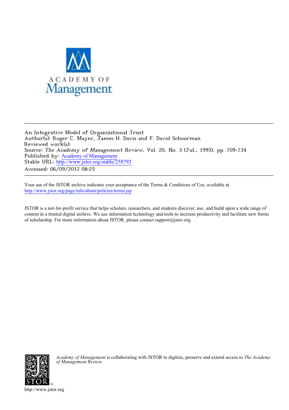This article raises a number of issues for the study of trust in organizations. Each is considered and dealt with in the development of a model of dyadic trust in an organizational context. The model proposed in this article is the first that explicitly considers both characteristics of the trustee as well as the trustor. The model clearly differentiates trust from