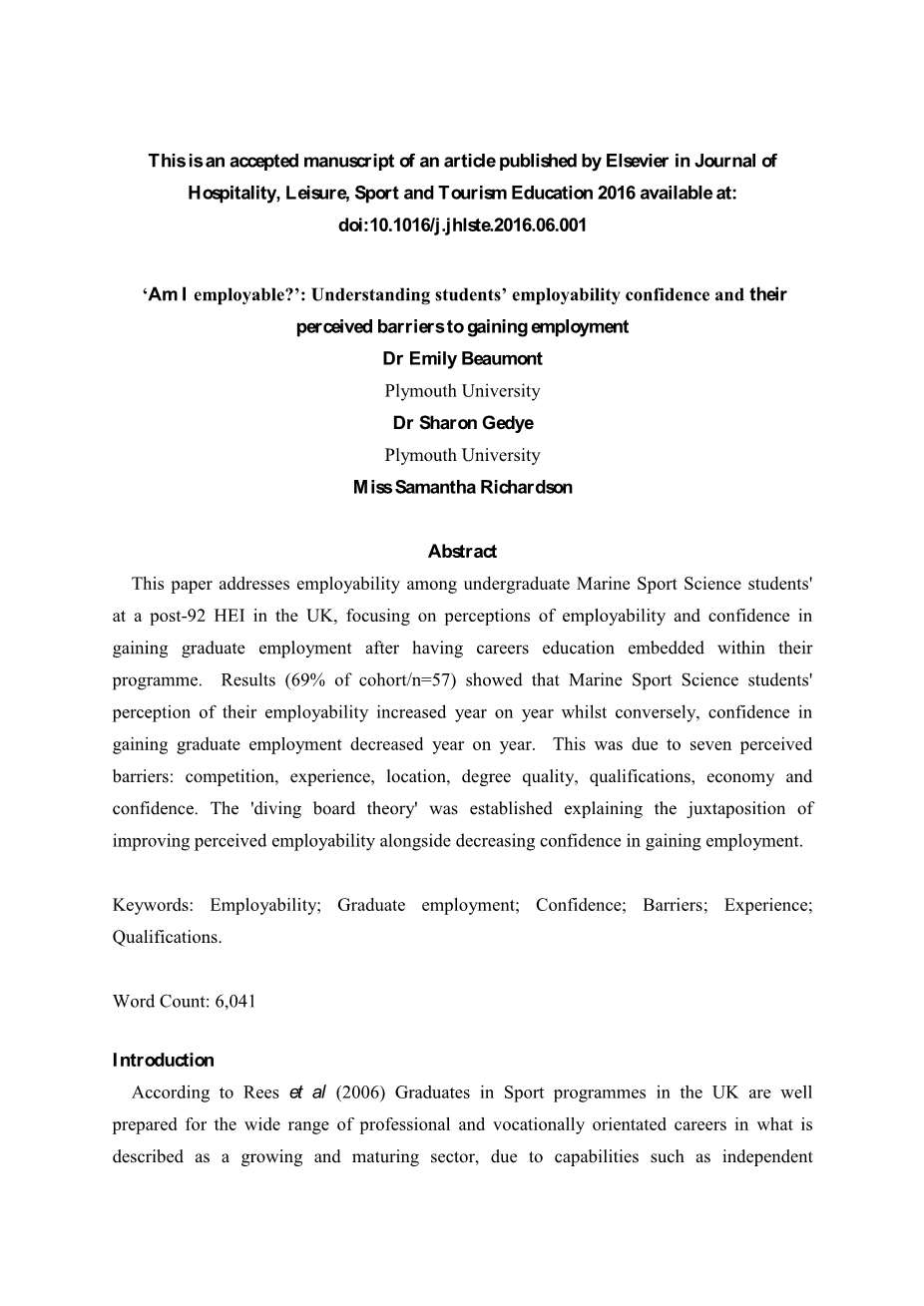 摘要:本文探讨了英国92后高等教育海洋运动科学本科学生的就业能力,重点研究了大学生对就业能力的看法,以及大学生在接受职业生涯教育后对初次就业的信心。结果(69% /n=57)显示,海洋运动科学系学生对其就业能力的认知逐年增加,而对其就业的信心则逐年下降。这是由七个可感知的障碍造成的:竞争、经验、地点、学位质量、任职条件、经济和信心。“跳板理论”解释了就业信心下降与就业感知能力提高的并存关系。