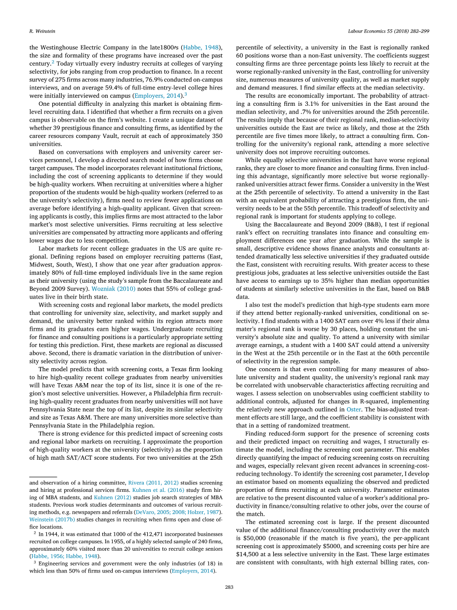 基于与雇主和大学就业服务人员的对话,我建立了公司如何选择目标校园的定向搜索模型。该模型纳入了相关的制度摩擦,包括筛选申请人以确定他们是否将成为高素质工人的成本。在较高比例的学生将是高素质员工(称为大学的选择性)的大学中招聘时,公司在确定高素质申请人之前,平均需要审查的申请数量较少。考虑到甄选申请人的成本很高,这意味着公司最受劳动力市场最挑剔的大学吸引。在选择较少的大学中招募的公司可以通过吸引更多的申请人并由于竞争较少而提供较低的工资来获得补偿。