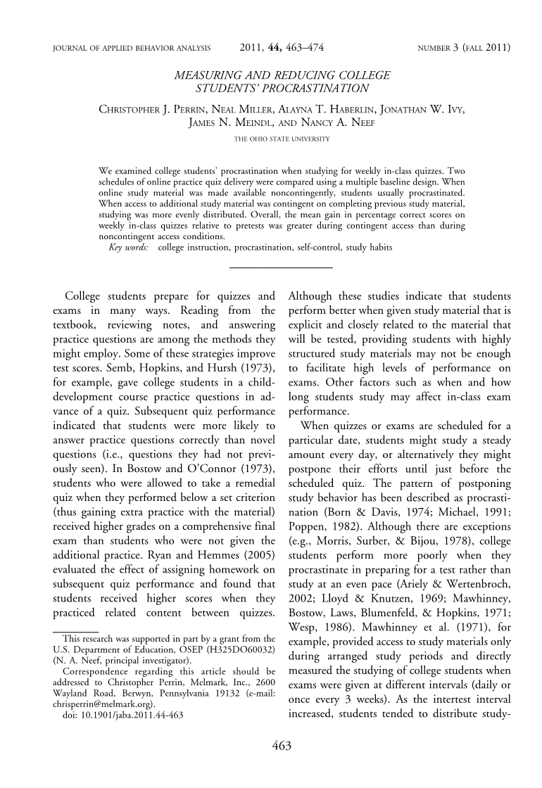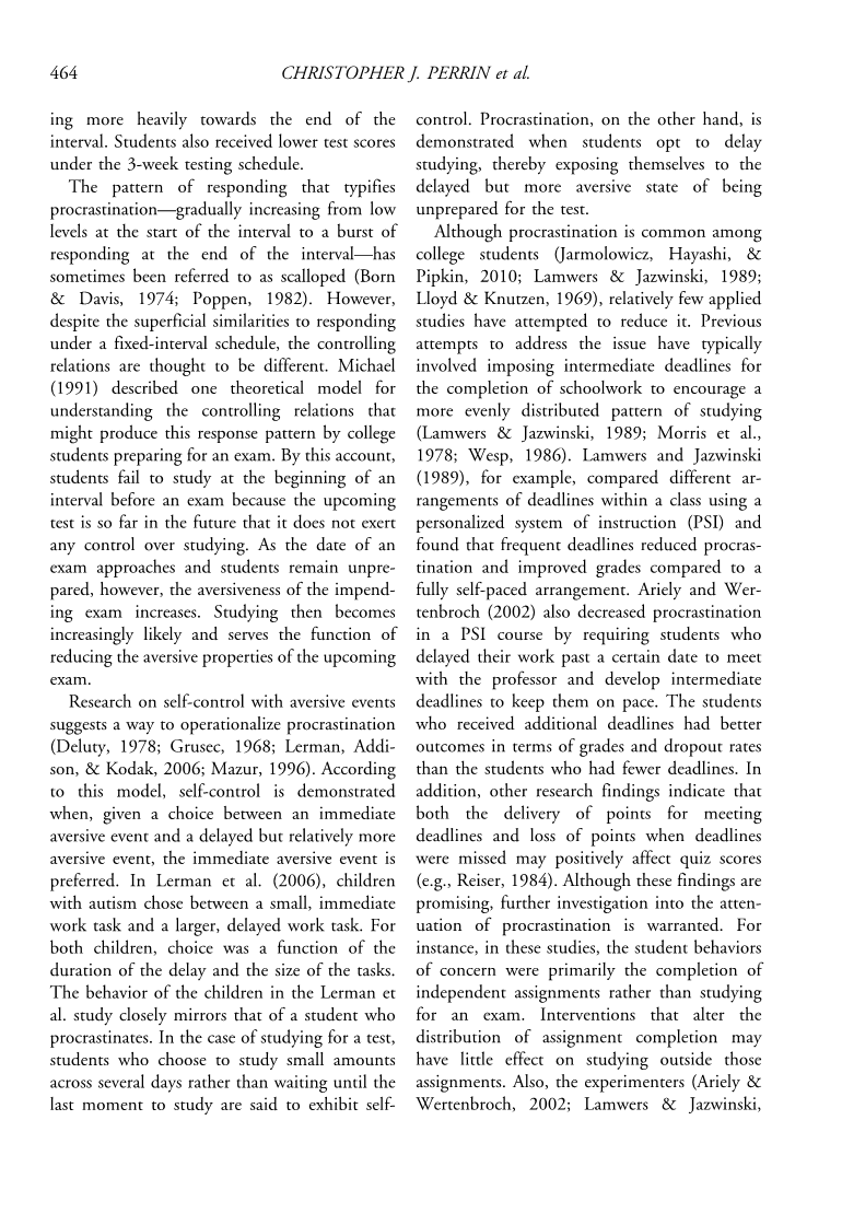 尽管拖延在大学生中是很普遍的(Jarmolowicz, Hayashi, amp;Pipkin, 2010; Lamwers amp; Jazwinski, 1989;Lloyd amp; Knutzen, 1969),很少有应用性研究试图去减少它。以往解决这一问题的尝试通常都会规定完成学业的中间期限,以鼓励分配更均匀的学习模式(Lamwers amp; Jazwinski, 1989; Morris et al.,1978; Wesp, 1986)。例如,Lamwers和Jazwinski(1989)使用个性化教学系统(PSI)比较了一个班级中截止日期的不同范围,发现频繁的最后日期与以自己速度安排的学习相比可以减少拖延,并提高成绩。Ariely和Wer tenbroch(2002)也减少了PSI课程中的拖延,他们要求那些在某个日期之后延迟工作的学生与教授会面,并开发中间期限以保持他们的进度。收到额外截止期限的学生在成绩和辍学率方面远比较少截止期限的学生表现好。除此之外,其他研究表明,在最后期限内提交分数和在错过最后期限时丢失分数都可能对测验成绩产生积极的影响(例如,Reiser,1984)。虽然这些发现是有希望的,但进一步研究减轻拖延是有必要的。例如,在这些研究中,关注的学生行为主要是完成独立作业,而不是为了考试而学习。对任务完成的分配的干扰对任务之外的学习干扰很小。(Ariely amp;Wertenbroch, 2002; Lamwers amp; Jazwinski,464CHRISTOPHER J. PERRIN et al. 1989; Morris et al., 1978; Reiser, 1984; Wesp,1986)实验使用组间设计来评估其干预的效果,从而使得关于干预个人行为模式效果的结论受到局限。