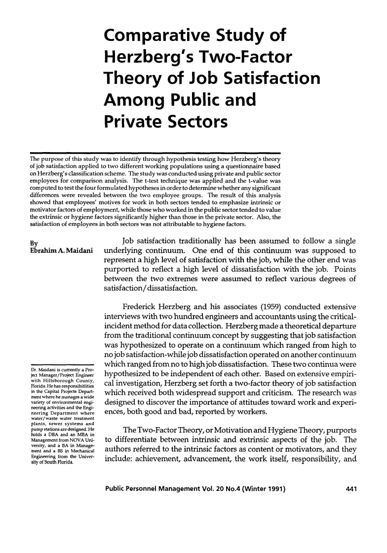 本研究的目的是用一个问卷来代替最初研究中使用的关键事件技术来重新检验赫兹伯格的工作满意度理论。这项研究是利用私营部门和公共部门雇员来比较这两个工作环境,并注