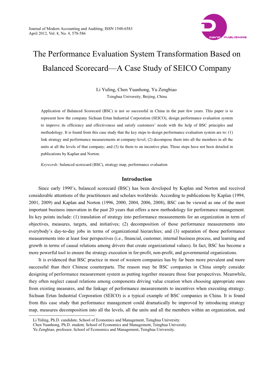 在SEICO的案例研究下,显示了中国公司的综合绩效评价体系重整过程。通过调整战略,SEICO决定以客户满意度作为其战略重点。然后他们通过制定新的绩效考评制度和重新设计了激励制度和绩效考核体系计划,这可以确保责任分配,每个人都和企业战略的执行有关系。这个案例是也平衡计分卡理论在中国管理实践中应用很好的案例, 这是中国罕见的成功应用。值得一提的是,绩效评估系统两个关键设计要点:公平性和目标一致性。公平性是指绩效指标可以衡量恰恰雇员的贡献,这取决于设计整体绩效考评系统。目标的一致性意味着系统必须确保个人目标与组织的目标一致,这可以通过激励方案来实现。在这种情况下,我们可以学习如何实现这两个方面的要求。
