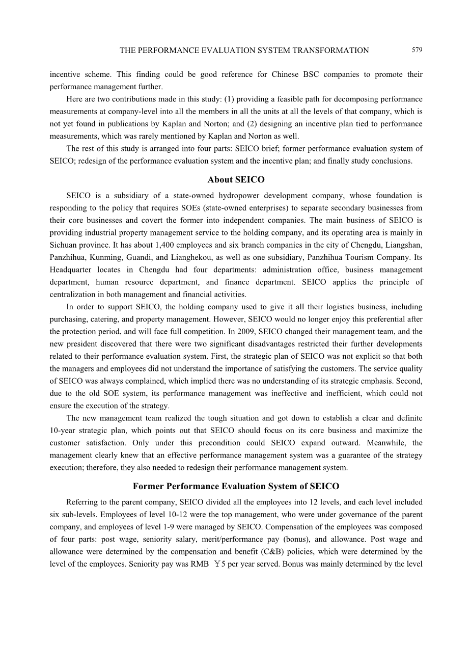 为了支持SEICO,控股公司给它他们所有的物流业务,包括采购,餐饮,物业管理。然而,SEICO将不再享受此优惠的后期保护,将面临全面竞争。 2009年,SEICO改变了自己的管理团队,以及新管理者发现,有两个显著的缺点限制了其进一步发展与他们的绩效评价体系。首先,SEICO的战略规划并没有明确,管理者和员工不明白满足客户的重要性。客户总是抱怨SEICO的服务质量,这意味着员工没有对其战略重点有正确的理解。 第二,由于老国企体制,绩效管理是无效和低效的,这不能确保战略的执行。