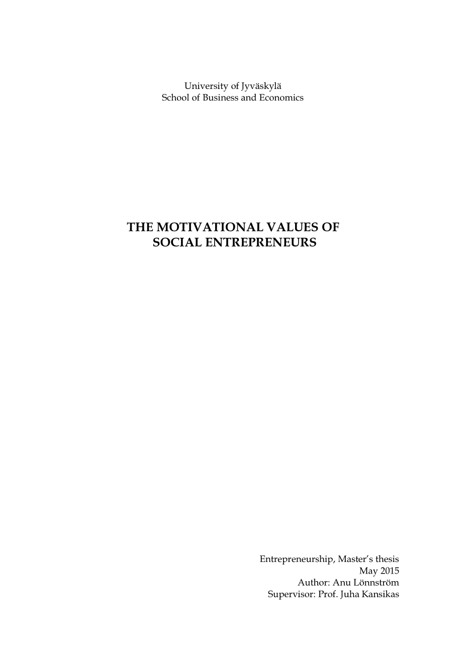 创业动机的研究已从传统的经济动机观转向了新的创业创新的主要动机。最近出现了一种认识认为可能有企业家创业的其他的、更相关的动机。在这种情况下社会企业家的社会收益和价值观被视为企业家的主要动机(Carsrud amp; Brauml;nnback 2011)。然而,一般的价值观和动机价值观的研究是非常罕见的社会创业文学。通过对动机价值观的研究,我们可以更好地了解社会企业家,或许他们决定创业不是商业。社会企业家的价值排序也可以揭示是否有社会价值和商业价值之间的矛盾,或者社会价值观推定社会创业文献的普遍的。