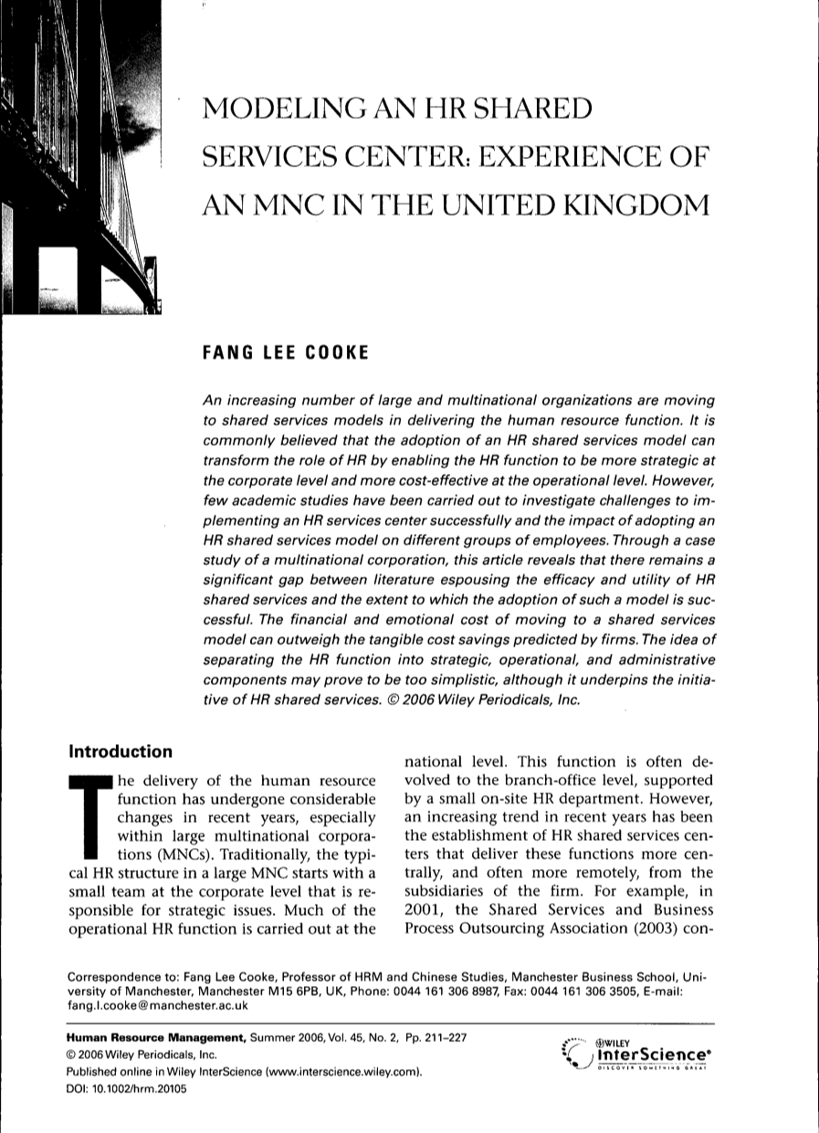 本文通过对跨国公司的案例研究来探讨这些问题,案例中包括了人力资源职能的重组和人力资源共享服务中心的构建。第一部分包括了人力资源共享服务中心近几年的应用趋势和其优势点。第二部分展示了案例研究的结果及通过人力资源共享服务给组织带来的改变。结论部分强调了案例研究中一些主要的问题和未来的一些相似组织如何应用该研究。