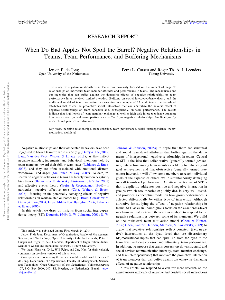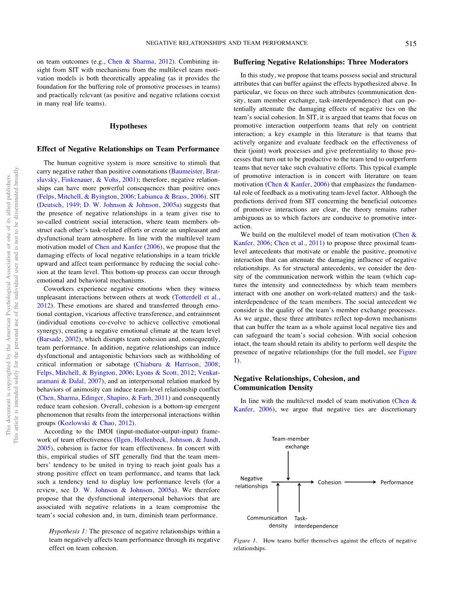 人类认知系统是携带消极而不是积极的内涵(Baumeister, Bratslavsky, Finkenauer, amp; Vohs, 2001)的刺激较敏感;因此,消极的关系可以有更强大的后果比积极(Felps, Mitchell, amp; Byington, 2006; Labianca amp; Brass, 2006)。SIT(Deutsch, 1949; D. W. Johnson amp; Johnson, 2005a)表明,负面的关系在一个团队的存在产生所谓的contrient社会交往,在团队成员阻挠对方的任务有关的努力,或造成不愉快的和不正常的团队氛围。在与Chen and Kanfer (2006)的多层次团队激励示范线,我们建议局部负的关系在一个团队的破坏性影响滴向上通过降低社会凝聚力的队伍等级影响团队绩效。这种自下而上的过程可以通过情绪和行为机制发生。
