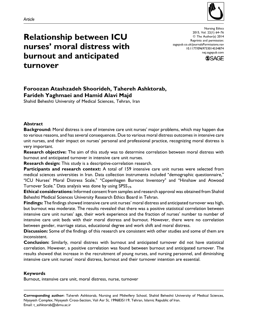 本次研究的目的是要理清伊朗ICU护士群体道德困境、倦怠程度以及离职倾向之间的关系。