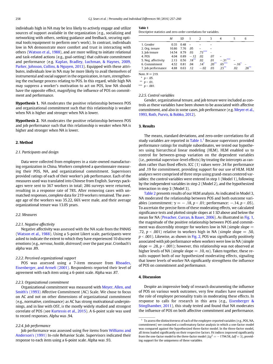 数据来自中国国有制造业组织的员工。工作人员完成了一项调查问卷,测量其POS,NA和组织承诺。监事对工作人员的工作表现提供了评级。使用的每个措施都用英文翻译成中文。调查包总共送到367名工人;回覆了286次调查结果,答复率达78%。在移除无法应对的案件后,仍有219名工作人员的完整数据。职工平均年龄35.22岁,男性66%,平均职工年龄13.05岁。