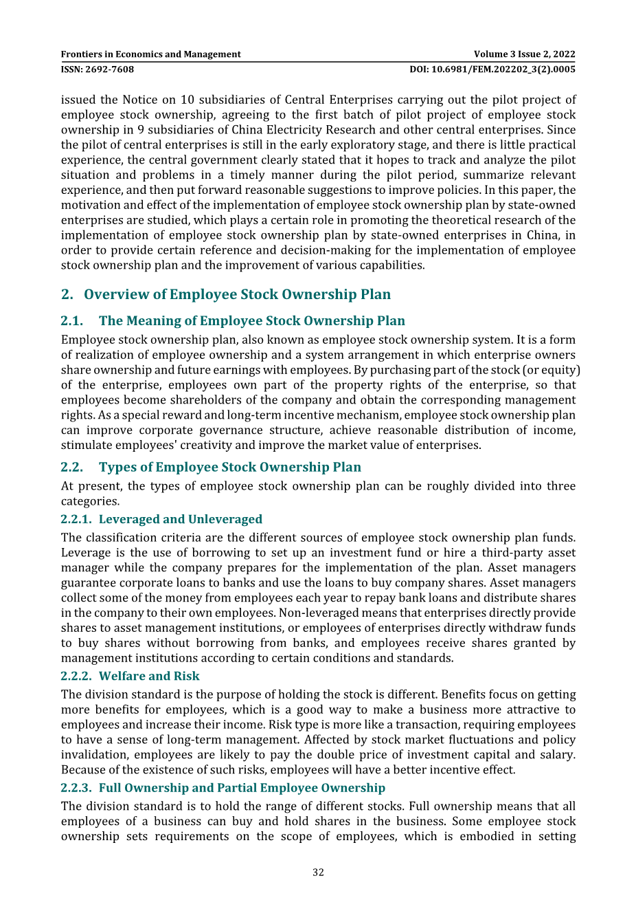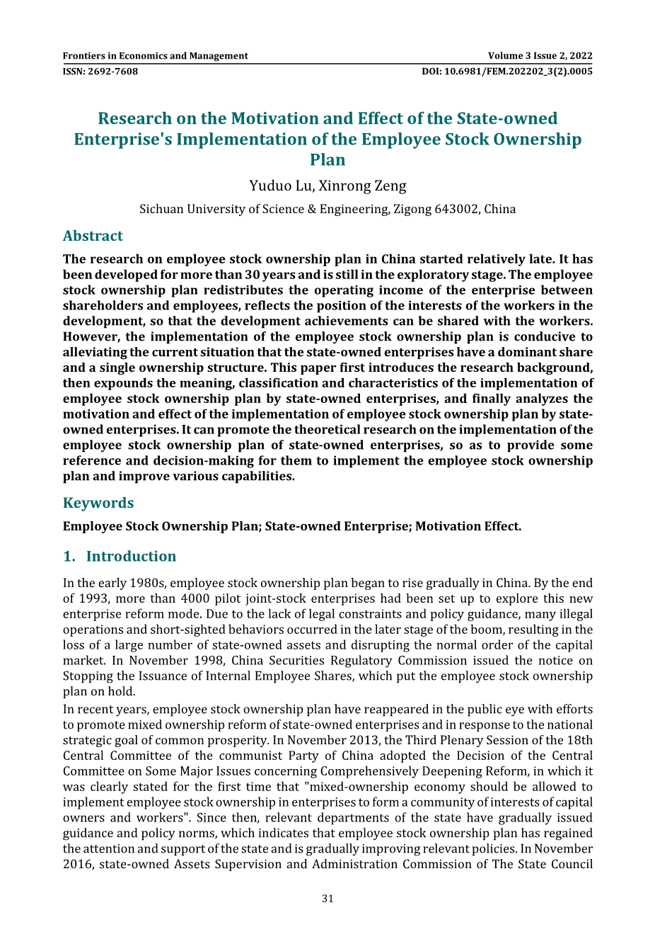 In the early 1980s, employee stock ownership plan began to rise gradually in China. By the end of 1993, more than 4000 pilot joint-stock enterprises had been set up to explore this new enterprise reform mode. Due to the lack of legal constraints and policy guidance, many illegal operations and short-sighted behaviors occurred in the later stage of the boom, resulting in the loss of a large number of state-owned assets and disrupting the normal order of the capital market. In November 1998, China Securities Regulatory Commission issued the notice on Stopping the Issuance of Internal Employee Shares, which put the employee stock ownership plan on hold. In recent years, employee stock ownership plan have reappeared in the public eye with efforts to promote mixed ownership reform of state-owned enterprises and in response to the national strategic goal of common prosperity. In November 2013, the Third Plenary Session of the 18th Central Committee of the communist Party of China adopted the Decision of the Central Committee on Some Major Issues concerning Comprehensively Deepening Reform, in which it was clearly stated for the first time that 'mixed-ownership economy should be allowed to implement employee stock ownership in enterprises to form a community of interests of capital owners and workers'. Since then, relevant departments of the state have gradually issued guidance and policy norms, which indicates that employee stock ownership plan has regained the attention and support of the state and is gradually improving relevant policies. In November 2016, state-owned Assets Supervision and Administration Commission of The State Council issued the Notice on 10 subsidiaries of Central Enterprises carrying out the pilot project of employee stock ownership, agreeing to the first batch of pilot project of employee stock ownership in 9 subsidiaries of China Electricity Research and other central enterprises. Since the pilot of central enterprises is still in the early exploratory stage, and there is little practical experience, the central government clearly stated that it hopes to track and analyze the pilot situation and problems in a timely manner during the pilot period, summarize relevant experience, and then put forward reasonable suggestions to improve policies. In this paper, the motivation and effect of the implementation of employee stock ownership plan by state-owned enterprises are studied, which plays a certain role in promoting the theoretical research of the implementation of employee stock ownership plan by state-owned enterprises in China, in order to provide certain reference and decision-making for the implementation of employee stock ownership plan and the improvement of various capabilities.
