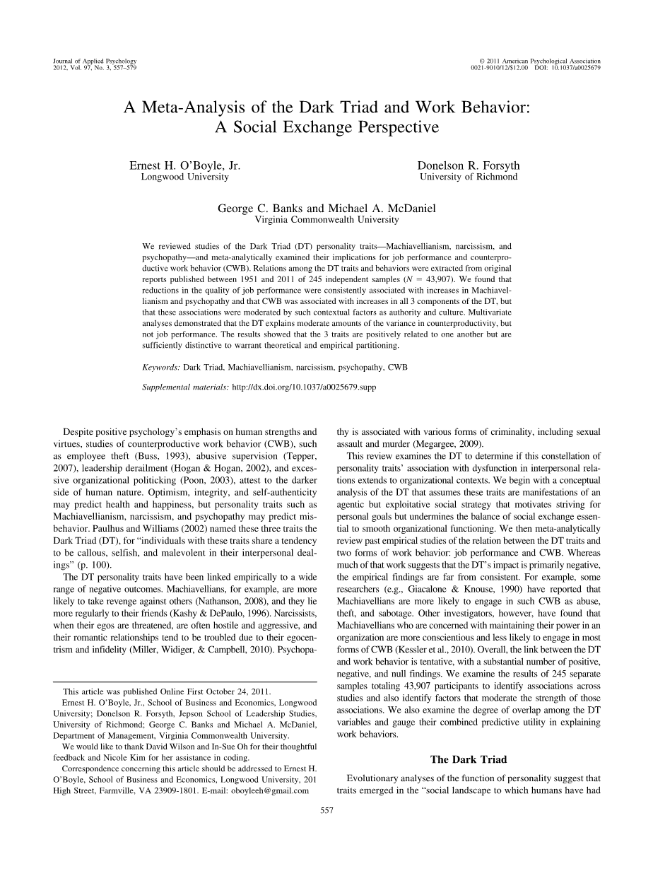 这篇综述检验DT这种人格特质是否与人际关系功能障碍的关联延伸到组织背景。我们首先对DT进行概念性分析,假设这些特征是代理性却剥削性的社会策略的表现,这种策略促使人们追求个人目标,但却破坏了平稳组织运作所必需的社会交换平衡。然后,我们以元分析的方法回顾了过去关于DT特征与两种工作行为形式(工作绩效和CWB)之间关系的实证研究。尽管这项研究表明DT的影响主要是负面的,但实证研究结果远非一致。例如,一些研究人员(如Giacalone amp; Knouse, 1990)称,马基雅维利主义者更有可能从事滥用、盗窃和破坏等CWB活动。然而,其他调查人员发现,马基雅维利主义者关心的是在组织中保持自己的权力,他们更有责任心,不太可能从事大多数形式的CWB活动(Kessleretal.,2010)。