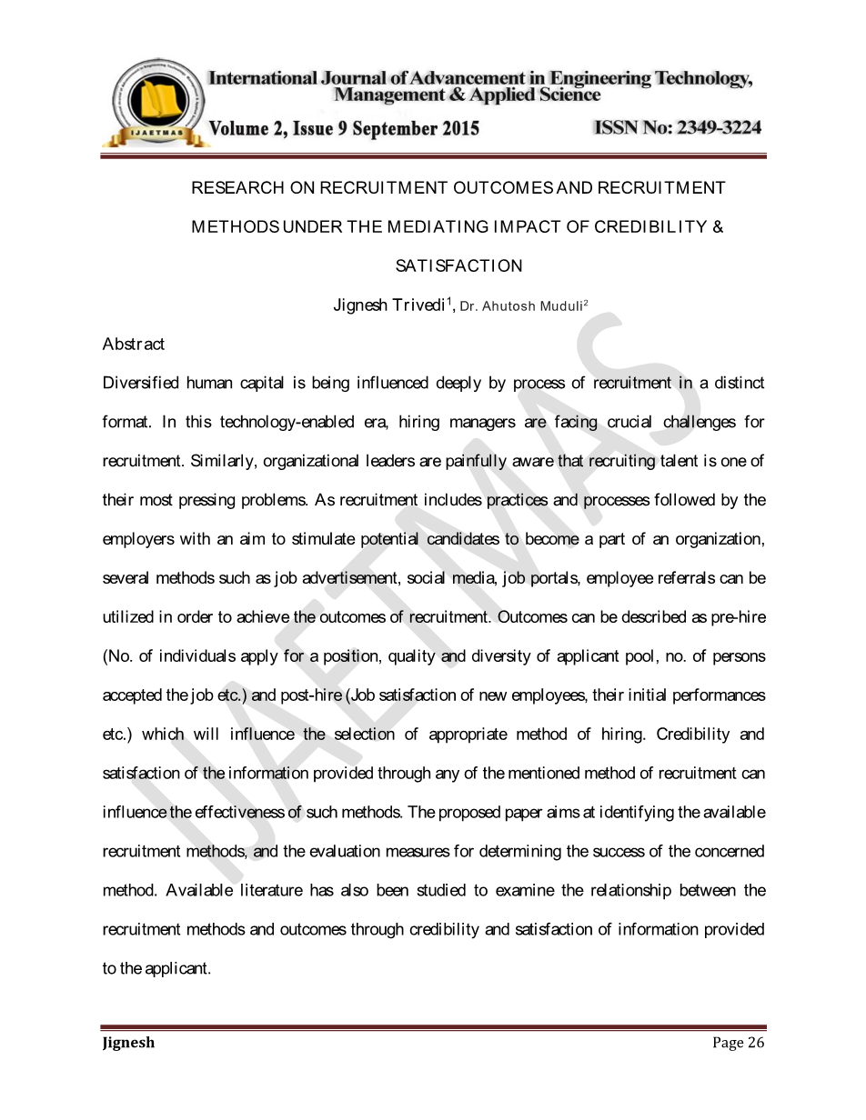 基于上述背景,本研究旨在研究招聘方式与招聘结果之间的关系。为了探索招聘方法(如招聘广告、在线招聘方法、员工推荐和社交媒体)与招聘结果之间的关系,我们调查了广泛的文献。此外,为了了解具体的招聘方法如何影响招聘结果,通过现有的文献研究了可信度和满意度作为中介变量的作用。