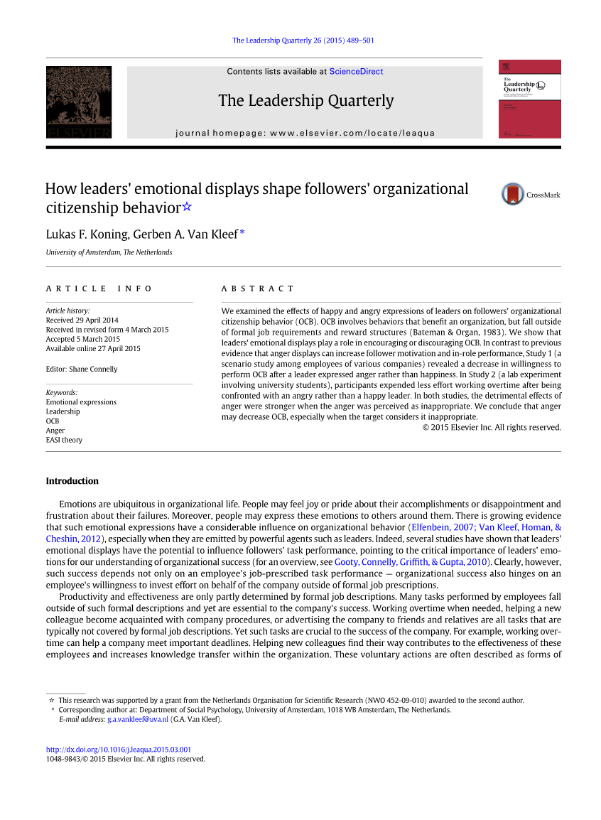 情绪在组织生活中无处不在。人们可能会对自己的成就感到高兴或自豪,也可能会对自己的失败感到失望和沮丧。此外,人们可能会向周围的人表达这些情绪。越来越多的证据表明,这种情绪表达对组织行为有相当大的影响(Elfenbein, 2007;(Van Kleef, Homan, amp; Cheshin, 2012),尤其是当他们被领导者释放的时候。事实上,有几项研究表明,领导者的情绪表现有可能影响追随者的任务绩效,指出领导者的情绪对我们理解组织成功至关重要(概述见Gooty, Connelly, Griffith, amp; Gupta, 2010)。然而,很明显,这种成功不仅取决于员工的工作规定的任务表现——组织的成功还取决于员工愿意在正式工作规定之外为公司付出努力。