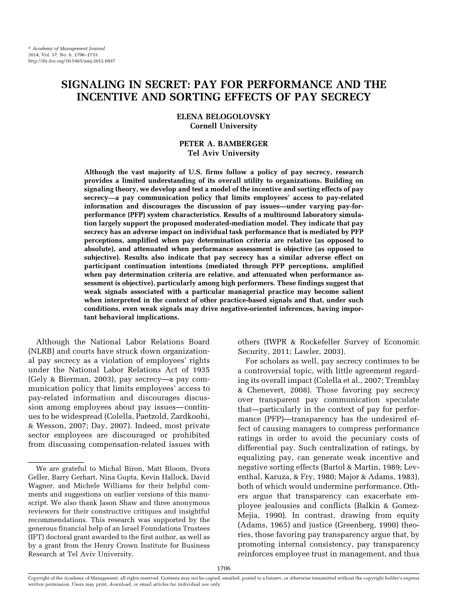 尽管绝大多数美国公司都遵循薪酬保密政策,但研究对其对组织的整体效用的理解有限。基于信号理论,我们开发并测试薪酬保密的激励和分类效果模型 - 薪酬沟通政策,限制员工访问与薪酬相关的信息,并阻止讨论薪酬问题 - 在不同的绩效薪酬下(PFP)系统特性。多环实验室模拟的结果在很大程度上支持所提出的调节中介模型。它们表明,薪酬保密对个人任务绩效产生了不利影响,这种影响是由PFP认知调节的,当薪酬确定标准是相对的(而不是绝对的)时放大,而当绩效评估是客观的(而不是主观的)时则会减弱。结果还表明,薪酬保密对参与者的持续意图具有类似的不利影响(通过PFP感知介导,当薪酬确定标准相对时放大,并且当绩效评估是客观时减弱),特别是在高绩效者中。这些研究结果表明,当在其他基于实践的信号的背景下解释时,与特定管理实践相关的微弱信号可能变得显着,并且在这种情况下,即使是微弱的信号也可能驱动负面导向的推论,具有重要的行为影响。