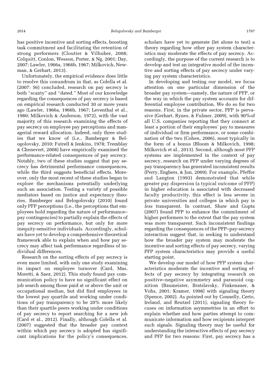 不幸的是,经验证据很难解决这个难题,正如Colella等人所做的那样。(2007:56)得出结论,关于工资保密的研究既“缺乏”又“过时”。我们关于工资保密后果的大部分知识是基于30年或更久以前进行的实证研究(Lawler,1966a,1966b,1967) ; Leventhal等,1980; Milkovich&Anderson,1972),这项研究的绝大部分研究了薪酬保密对员工薪酬感知和管理奖励分配的影响。实际上,我们所知道的只有三项研究(即Bamberger&Bel-ogolovsky,2010; Futrell&Jenkins,1978; Tremblay和Chenevert,2008)经验性地检验了薪酬保密的绩效相关后果。值得注意的是,其中两项研究表明,薪酬保密会产生不利的绩效后果,而第三项研究则表明有益效果。此外,只有最近的这些研究开始探索潜在的这种关联潜在的机制。基于正义和期望理论测试各种可能的调解员,Bamberger和Belogolovsky(2010)发现,只有PFP认知(即员工对绩效性质的看法 - 支付意外事件)才能部分解释薪酬保密对绩效的影响。 ,但仅限于对不平等敏感的个人。因此,学者们尚未建立一个全面的理论框架,能够解释薪酬保密何时以及如何影响任务绩效,而不论个人差异如何。