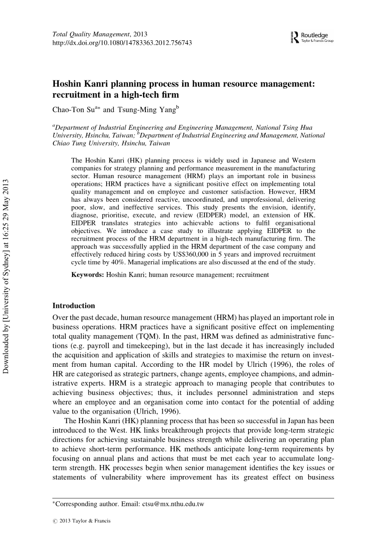 本文首先回顾了有关方针管理(HK)、人力资源管理和招聘流程改进案例的文献,并介绍了相关方法和案例研究的实施,我们讨论了管理方面的影响,并在最后一节提出结论性意见。