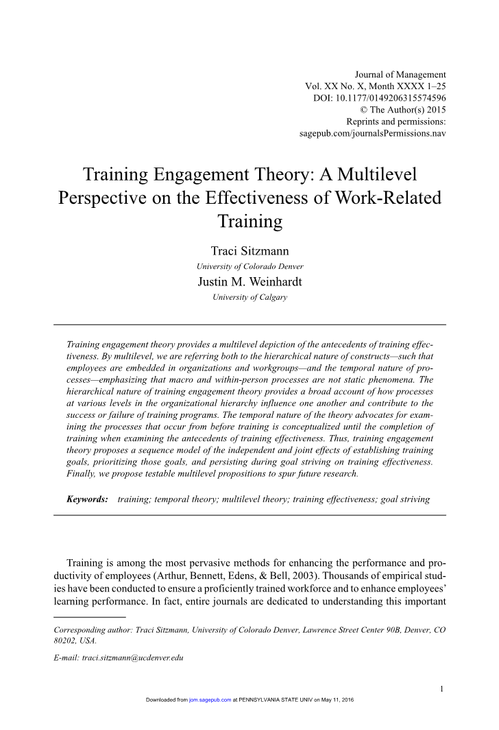从多层次的分析中着眼于培训参与对于捕捉人类行为的复杂性至关重要,因为组织中的大多数行为都受到各种分析层面现象的影响(Hitt,Beamish,Jackson,&Mathieu,2007) 。此外,时间是动机行为的重要组成部分(Kanfer,2012; Steel&Kouml;nig,2006)。目标努力过程作为一系列经验流动,因此专注于行为的静态快照提供了对目标实现所必需的选择范围的不完整描述(Beal,Weiss,Barros,&MacDermid,2005; Steel&Kouml;nig) )。培训参与理论的多层次性质提供了一个全面的说明,即组织层级中众多时间点和不同层次的因素如何相互影响,并有助于培训的有效性。