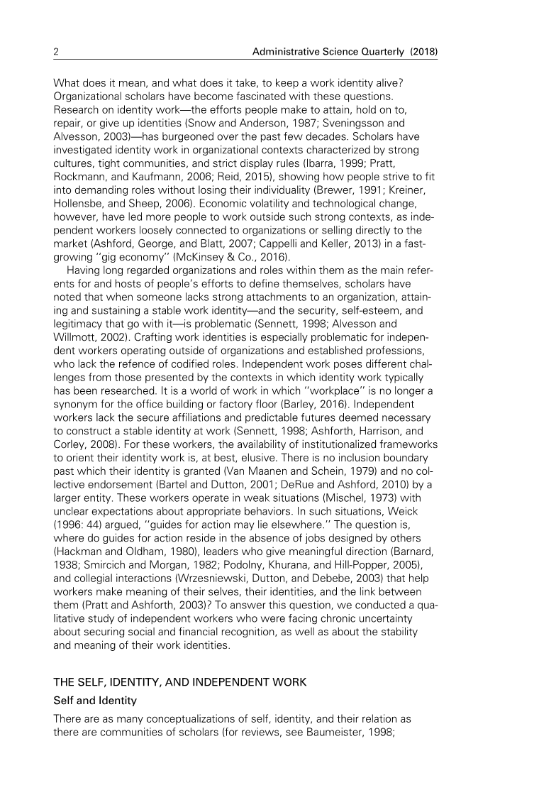 由于长期以来,人们一直把组织和组织内的角色视为定义自己的主要参照者和主人,学者们注意到,当一个人对组织缺乏强烈的依恋时,获得并维持稳定的工作身份,以及随之而来的安全感、自尊和合法性是有问题的(桑尼特1998;Alvesson and Willmott, 2002)。对于在组织和既定职业之外工作的独立工作者来说,塑造工作身份是一个很大的问题,因为他们缺乏系统化角色的参照。独立工作带来的挑战与身份工作通常研究的背景不同。这是一个工作的世界,“workplace”不再是办公楼或工厂楼层的同义词(Barley,2016)。独立工作者缺乏被认为在工作中构建稳定身份所必需的安全从属关系和可预测的未来(Sennett,1998;Ashforth,Harrison,and Corley,2008)。对于这些工作者来说,能否找到制度化的框架来定位他们的身份工作,充其量也是个未知数。他们的身份没有被认可的包容边界(Van Maanen和Schein,1979),也缺乏集体认可(Bartel和Dutton,2001;德鲁和阿什福德,2010)。这些独立工作者在相较弱的环境中工作(Mischel,1973),对适当的行为没有明确的期望。Weick(1996: 44)认为,在这种情况下,“行动指南可能在其他地方。问题是,如果没有其他人设计的工作((Hackman and Oldham,1980年),没有给予指导的领导者(Barnard1938年;Smircich和Morgan,1982;Podolny, Khurana, and Hill-Popper, 2005),以及组织社团(Wrzesniewski, Dutton, and Debebe, 2003)这类帮助员工理解自己,理解身份以及他们之间的联系(普拉特和阿什福思,2003)的组织,独立工作者的行动指南应该在哪里?为了回答这个问题,我们对独立工作者进行了定性研究,这些人长期以来都面临着社会和经济认可的不确定性,工作身份的稳定性和意义的不确定性。