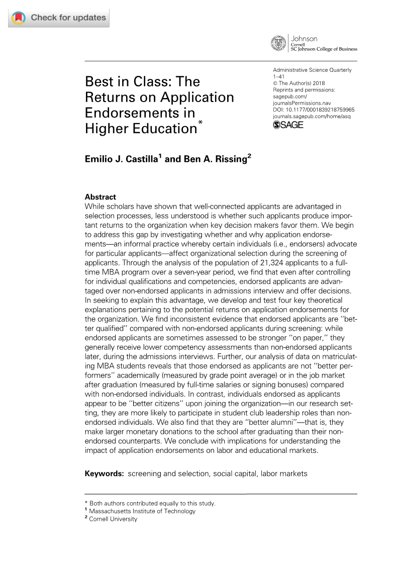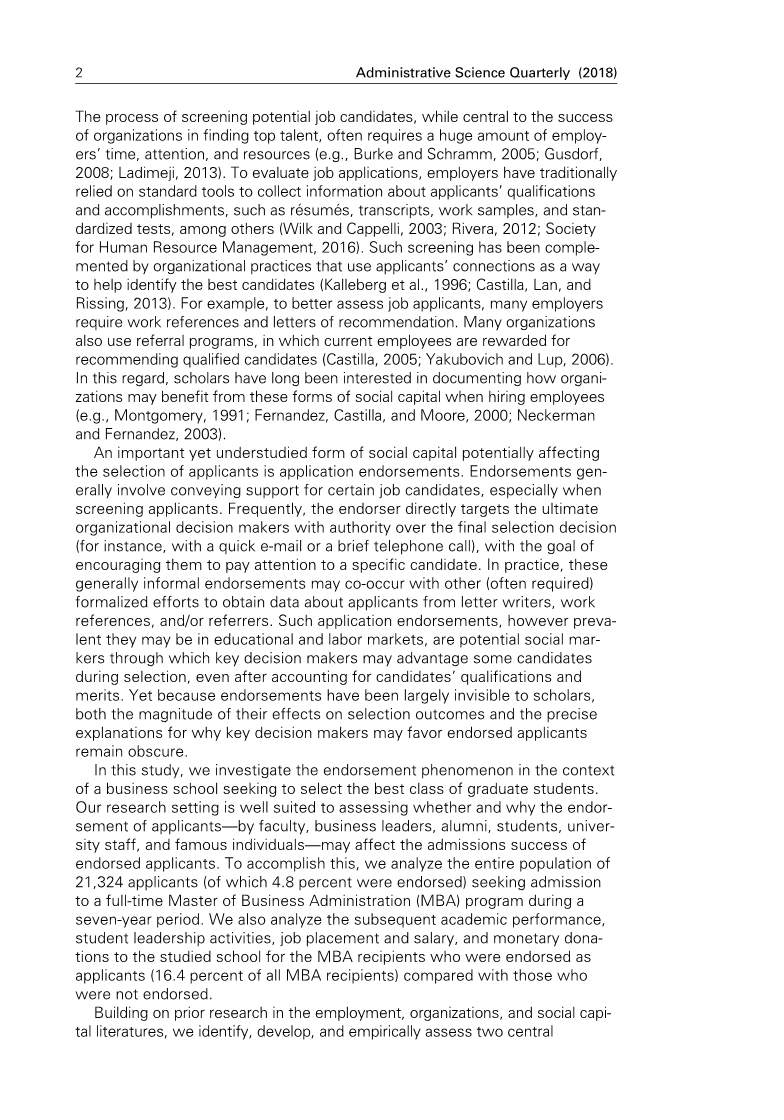 一种重要但尚未得到充分研究的社会资本形式是申请背书,它可能影响申请人的选择。背书通常包括对某些求职者的支持,尤其是在筛选求职者时。通常,背书人直接针对具有最终选择决策权的最终组织决策者(例如,通过快速的电子邮件或简短的电话),目的是让他们关注特定的候选人。在实践中,这些通常非正式的背书可能与其他(通常需要)正式的努力同时发生,以便从写信者、工作介绍人或介绍人那里获得关于申请人的数据。这种申请背书,无论在教育和劳动力市场多么普遍,都是潜在的社会标志,关键的决策者可以通过这种社会标志,在选择某些候选人时对其有利,即使在考虑了候选人的资格和优点之后也是如此。然而,由于背书在很大程度上对学者来说是不可见的,因此,它们对选择结果的影响程度,以及关键决策者为何可能青睐背书申请人的确切解释,都仍不明朗。