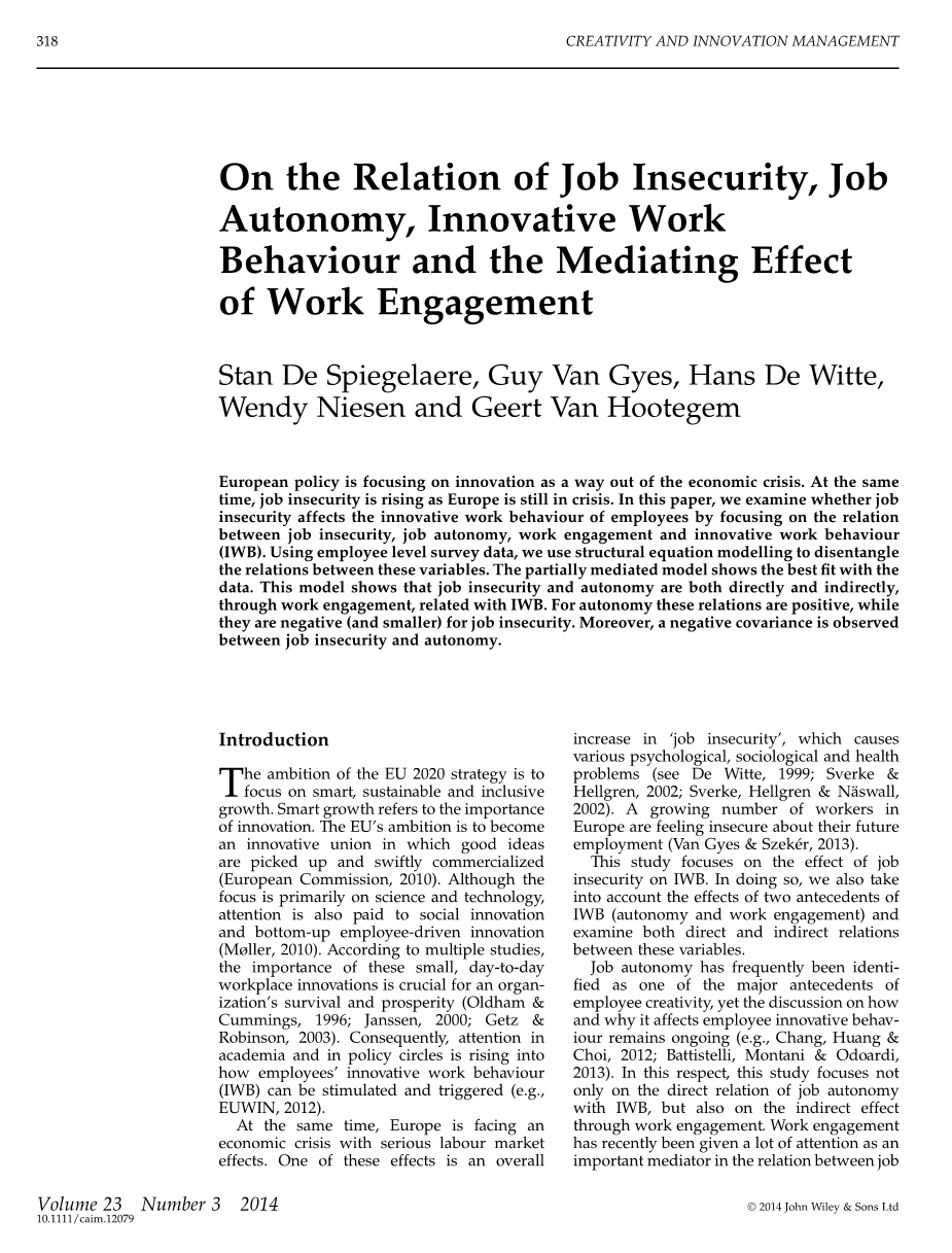 欧盟2020战略的目标是专注于智能,可持续和包容性增长。智能增长意味着创新的重要性。欧盟的目标是成为一个创新的联盟,在其中获得好的想法并迅速商业化(欧盟委员会,2010)。虽然重点主要放在科学和技术上,但也注重社会创新和自下而上的员工驱动创新(Moslash;ller,2010)。根据多项研究,这些小型的日常工作场所创新对于组织的生存和繁荣至关重要(Oldham&Cummings,1996; Janssen,2000; Getz&Robinson,2003)。因此,学术界和政策界的关注正在上升到如何刺激和触发员工的创新工作行为(IWB)(例如,EUWIN,2012)。与此同时,欧洲正面临着严重的劳动力市场影响的经济危机。其中一个影响是“工作不安全感”整体上升,导致各种心理,社会和健康问题(见De Witte,1999; Sverke&Hellgren,2002; Sverke,Hellgren和Nauml;swall,2002)。欧洲越来越多的工人对未来的就业感到不安(Van Gyes&Szekeacute;r,2013)。本研究关注的是工作不安全对IWB的影响。在这样做时,我们还考虑了IWB的两个前因(自治和工作投入)的影响,并检查这些变量之间的直接和间接关系。工作自主权经常被认为是员工创造力的主要前因之一,但仍然存在影响员工创新行为的方式和原因(例如,Chang,Huang&Choi,2012; Battistelli,Montani和Odoardi,2013)。在这方面,本研究不仅关注工作自主与IWB的直接关系,还关注通过工作投入的间接影响。通过研究这些直接和间接的关系,本文回应了创新文献中的各种要求(Shalley&Gilson,2004; Shalley,Zhou&Oldham,2004),以明确地模拟员工创新前因的直接影响和通过工作投入。这项研究是第一个研究工作不安全感和创新工作行为之间关系的研究之一(Niesen,DeWitte&Battistelli,2011)。在这方面,我们的研究为创新文献做出了贡献,这些创新文献在很大程度上忽视了作为可能前提的工作保障,并且在将员工成果范围扩展到IWB时,也为员工创新文献做出了贡献。在实践方面,本研究对创新管理者和决策者有影响。如果工作不安全与IWB负相关,创新经理应该为希望为创新做出贡献的员工提供安全的工作。自治也是如此;如果我们发现了重大影响,创新经理应该给予员工足够的自由裁量权来执行他们的工作任务。对决策者而言,这项研究可能表明,欧洲工作不安全状况的增加不是一个中立的过程,可能会对创新议程产生负面影响(De Spiegelaere,Van Gyes和Van Hootegem,2013)。