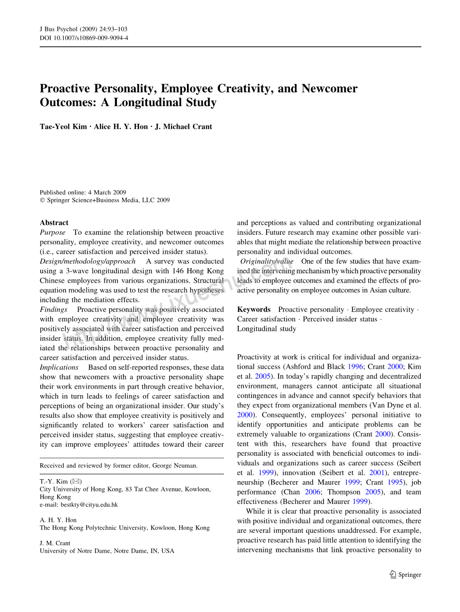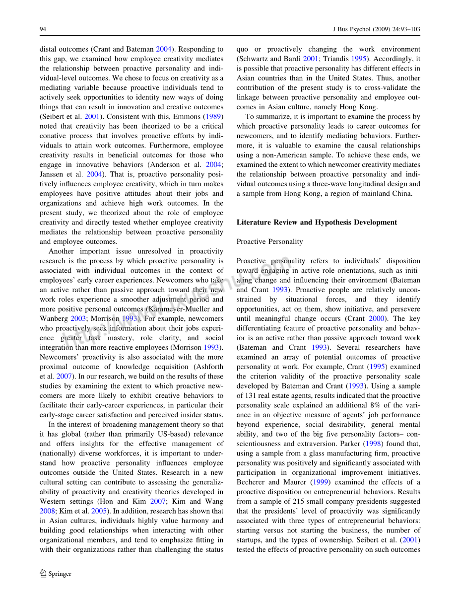 在主动性人格的研究中尚未解决的另一个重要问题是在员工早期职业经历的背景下,主动性人格与个人结果相关联的过程。对新工作角色采取主动而非被动方式的新移民经历了更平稳的调整期和更积极的个人成果(Kammeyer-Mueller和Wanberg 2003;Morrison 1993)。例如,主动寻求有关其工作信息的新移民比更多反应性员工经历更多的任务掌握、角色清晰度和社会融合(Morrison 1993)。新移民的积极性也与知识获取的近端结果有关(Ashforth等人,2007)。在我们的研究中,我们通过研究更有可能表现出创造性行为以促进他们早期职业经历,特别是他们的早期职业满意度和感知内幕状态的新移民的基础上进行。