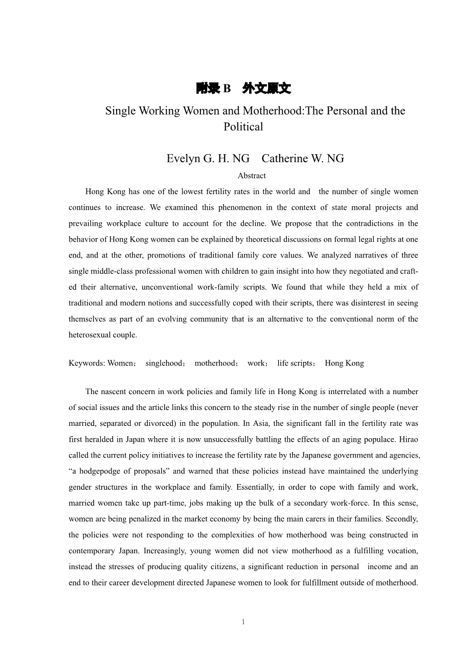 在我们的日常生活中,宏观环境将个体的个人决策过程语境化。这三名被调查者成为单身母亲的原因各不相同。没有一个人打算挑战香港社会的习俗,而是带着自我反省、自信和自力更生的态度,处理他们个人环境中不可预见的变化,以及后来他们生活中出现的分配问题。作为一个公认的精英社会中的个体,这三位单身母亲充分利用了她们所能获得的教育和职业机会来协商她们的多重人格角色。所有人都关心自我发展,在追求更高的学位时都非常努力,要么是在他们年轻的时候(有时没有父母的鼓励),要么是在他们建立自己的职业生涯时。所有人都确保自己在工作中表现出色,财务状况稳定。人们感觉到,只要他们继续表现出色,他们的同事对待他们的方式就和对待其他人没什么不同。他们没有询问女同事个人情况的变化,因为这些变化没有对她的工作能力产生不利影响。我们的被调查者在其各自组织内的职位似乎没有因其单身母亲身份而受到影响。可以理解,他们面临着巨大的时间压力,但他们清楚自己在工作与家庭平衡和职业发展问题上的立场,并愿意付出必要的努力来维持他们的工作和生活水平。考虑到香港高度竞争、资本主义和长时间工作的文化,这些都是不小的努力。