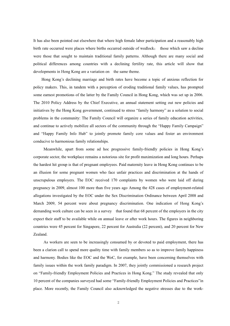 香港在工作政策和家庭生活方面出现的新问题,与一些社会问题有关。文章认为,单身人士(从未结婚、分居或离婚)的数目不断上升,与此有关。在亚洲,生育率的显著下降首先是在日本被发现的,日本目前正在与人口老龄化的影响作斗争,但没有取得成功。Hirao称目前日本政府和机构提高生育率的政策举措是“大杂烩式的提议”,并警告说,这些政策反而维持了工作场所和家庭中潜在的性别结构。从本质上讲,为了应付家庭和工作,已婚妇女从事兼职工作,这些工作构成了第二劳动力的大部分。从这个意义上说,妇女在市场经济中由于成为家庭的主要照顾者而受到惩罚。其次,这些政策没有对当代日本母亲的复杂结构作出反应。越来越多的年轻女性不再把做母亲视为一种令人满足的职业,相反,培养高素质公民的压力、个人收入的大幅下降以及职业发展的终结,促使日本女性在做母亲之外寻求成就感。其他地方也有人指出,女性劳动参与率高、出生率相对较高的地方是婚外生育的地方;那些看到下降的是那些寻求保持传统家庭模式的家庭。虽然生育率下降的国家之间存在许多社会和政治上的差异,但本文将表明,香港的发展是同一主题的一个变体。