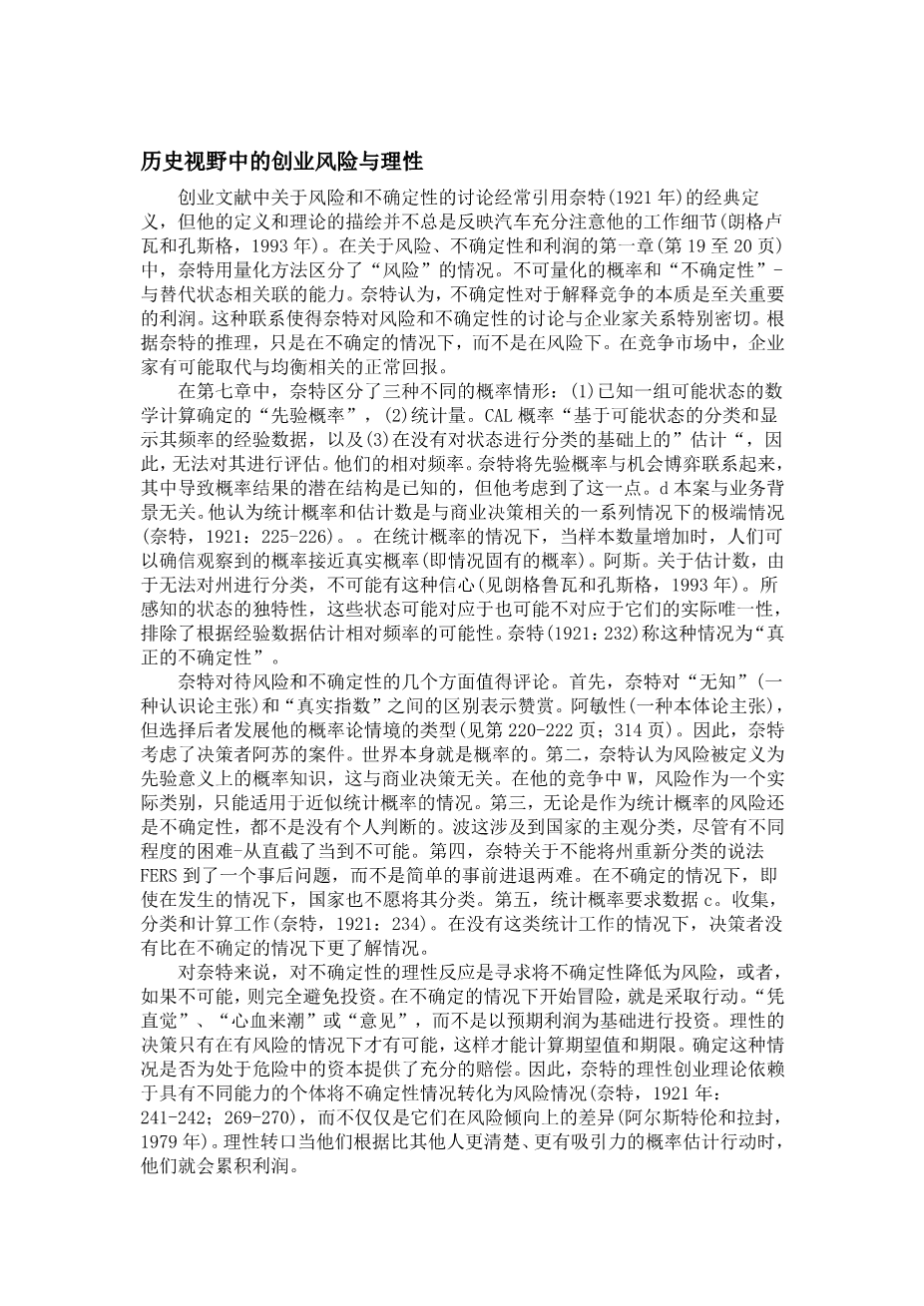 Discussions of risk and uncertainty in the entrepreneurship literature frequently reference Knight’s (1921) classic definitions, yet portrayals of his definitions and theory do not always reflect careful attention to the details of his work (Langlois and Cosgel, 1993). In the opening chapter of Risk, Uncertainty, and Profit (pages 19–20), Knight distinguished between cases of ‘risk,’ with quantifiable probabilities, and ‘uncertainty,’ with nonquantifiable prob- abilities associated with alternative states. Knight argued that uncertainty was essential to explaining the nature of competition and profit. This connection makes Knight’s discussion of risk and uncertainty particularly germane to the field of entrepreneur- ship. By Knight’s reasoning, only under uncertainty, rather than risk, can it be possible for entrepreneurs to supersede the normal returns associated with equilibrium in competitive markets