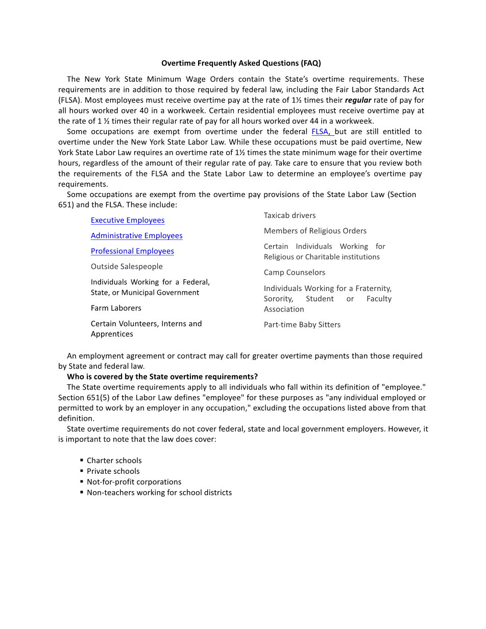 纽约州最低工资令含有纽约州的加班要求。这些要求是联邦法律所要求的,包括公平劳工标准法案(FLSA)。大多数员工必须以每日工作周数超过40的所有工作时间的正常工资率1.5倍的速度领取加班工资。某些住宅雇员必须以每日工作周数超过44的所有工作时间的正常工资率1.5倍的速度领取加班工资。